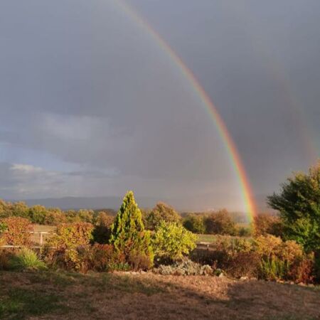 Am frühen Nachmittag bringt uns der Bus zurück zum nahen Campingplatz. Nach einem Regenschauer werden wir bei unserer täglichen Besprechung mit einem farbenprächtigen Regenbogen belohnt.