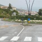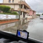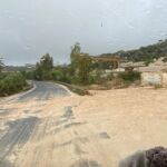Offensichtlich hat es hier gerade stark geregnet; die Straße ist halbseitig überflutet und von den Seitenstraßen wurden Unmengen von Geröll und Kies auf die Fahrbahn gespült.