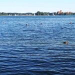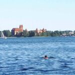 Unsere Tour heißt ja „Baltikum mit St. Petersburg“ – schlussendlich haben wir heute das Baltikum erreicht und überquerem die Grenze nach Litauen. Unser Ziel ist fantastisch: Der traumhaft gelegene Campingplatz von Trakai, gleich gegenüber der gleichnamigen Bilderbuchwasserburg. Was gibts Feineres, als sich bei 28 Grad ins kühlende Nass zu stürzen?
