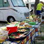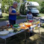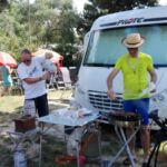 Heute hatten wir einen Ruhetag. Ausschlafen, spät frühstücken, relaxen, baden gehen – so oder ähnlich sah der Vormittag aus. Am Nachmittag wurde Gemüse geschnippelt und Salate für unsere Campertafel vorbereitet. Bevor die für Kroatien typischen Cevapcici auf dem Grill landeten, spendierte unser heutiges Geburtstagskind erst mal eine Runde Sekt. Dann kamen unsere Grillmeister zum Einsatz, das Salatbüffet wurde aufgebaut und das eine oder andere Fäßchen Bier angezapft. Bei sommerlichen Temperaturen saßen wir gemütlich zusammen und ließen es uns schmecken.