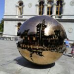Ein Gebäude der Universität Trinity. Die große Bronzeglobus vor der Hauptbibliothek trägt den Namen „Sphere with Sphere“. Die Statue ist ein Geschenk des italiensichen Bildhauers Antonio Pomodorro, der damit die Zerrissenheit der Welt zeigen will.