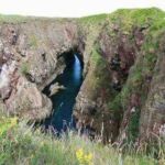 Slains Castle, eine bizarre Ruine am Meer, die man mit einem kleinen Fußmarsch erreichen kann. Die Bullers of Buchan ist eine Naturbrücke, die vom Meer durchspült wird. In den Felsen brüten viele Seevögel. Anschließend waren wir zum Campingplatz, nicht ohne noch einen Blick auf die Schiffe im Hafen zu werfen.
