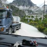 Erster Fahrtag, wir passieren die Ortschaft Marina di Carrara mit Blick auf den Marmorhafen von Carrara und hinüber zu den Steinbrüchen. Das Wetter spielt nicht wirklich mit. Es gießt wie aus Eimern und wir denken darüber nach den Besuch im Steinbruch zu streichen. Das Wasser kommt uns auf der Straße in Strömen entgegen, trotzdem problemlose Fahrt zum Marmorsteinbruch. Wir machen das!