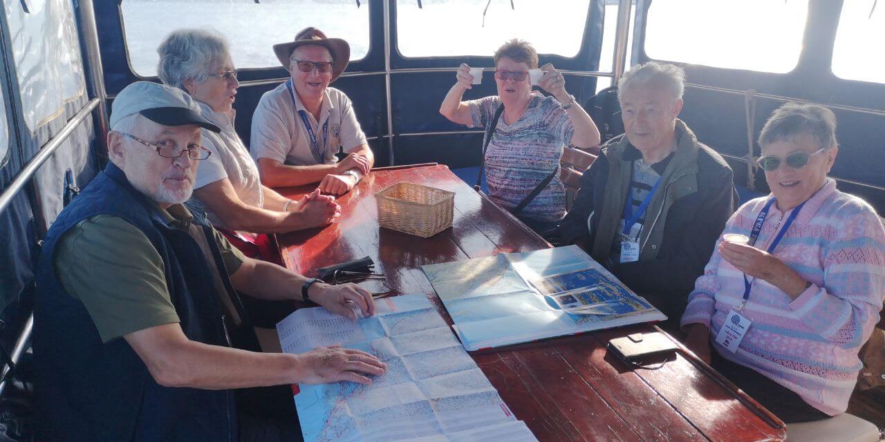 8:15 Uhr Abmarsch vom Campingplatz zum Bootsanleger, wo wir nach strammen Marsch das Boot und die besten Plätze in Beschlag nahmen. Die Nachhut, schoffiert von Max, war auch bald da und alle fanden Ihre bevorzugen Plätze.
