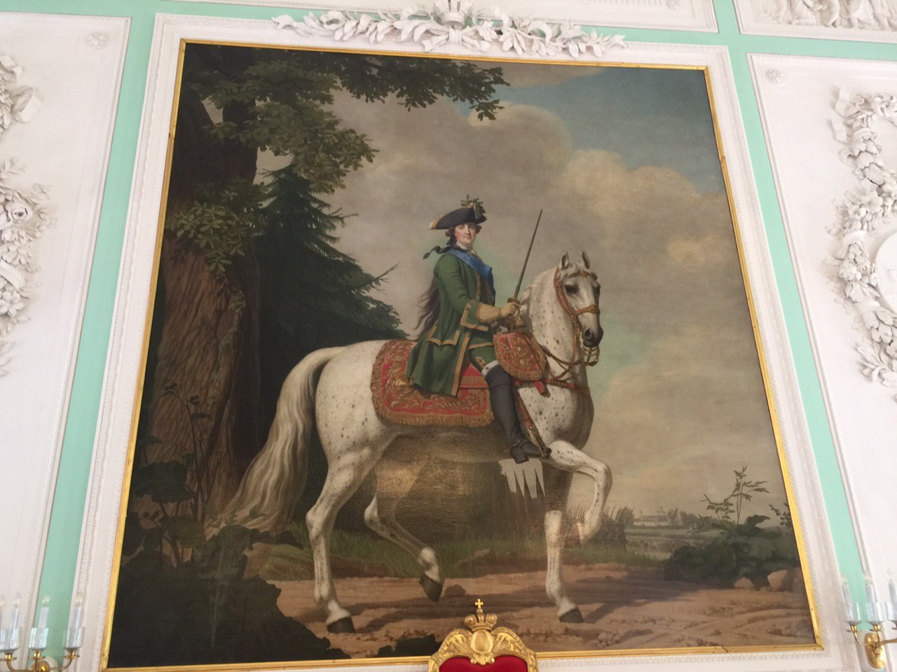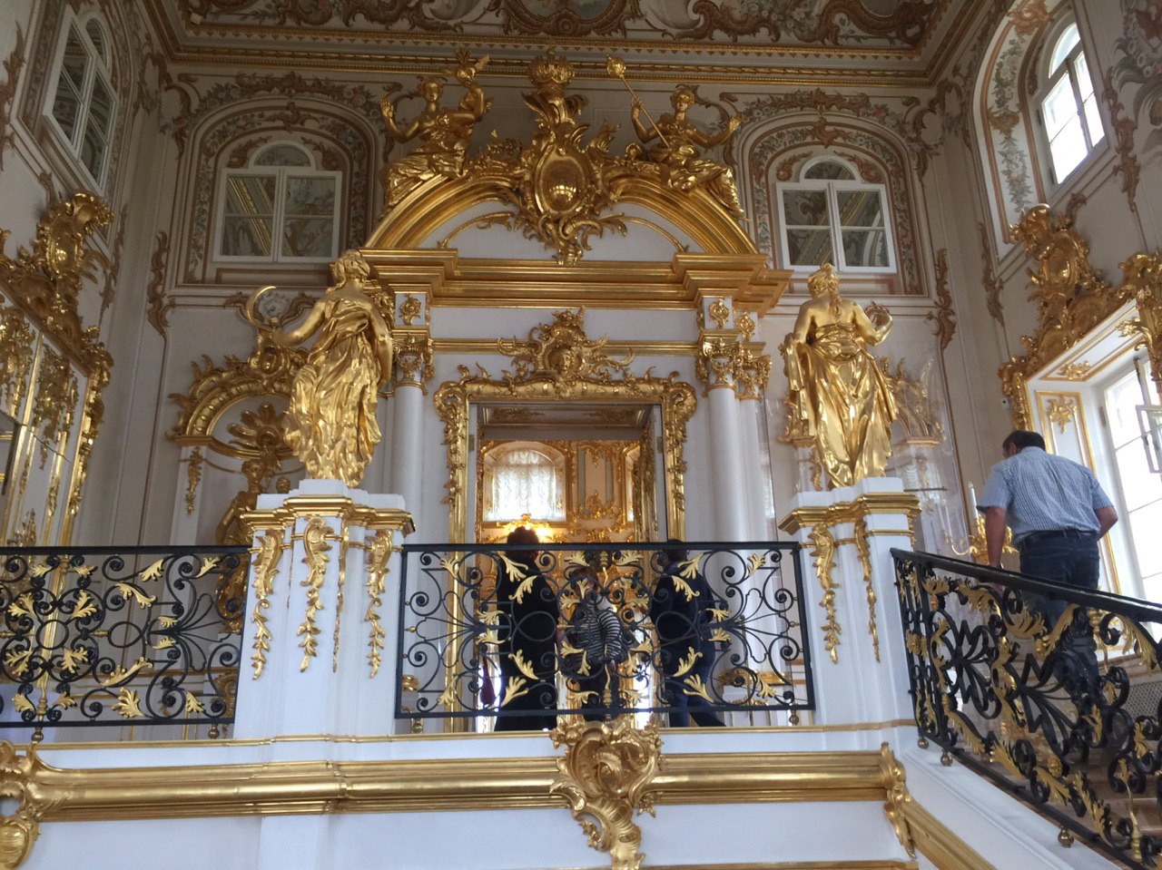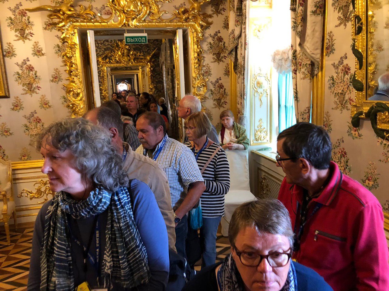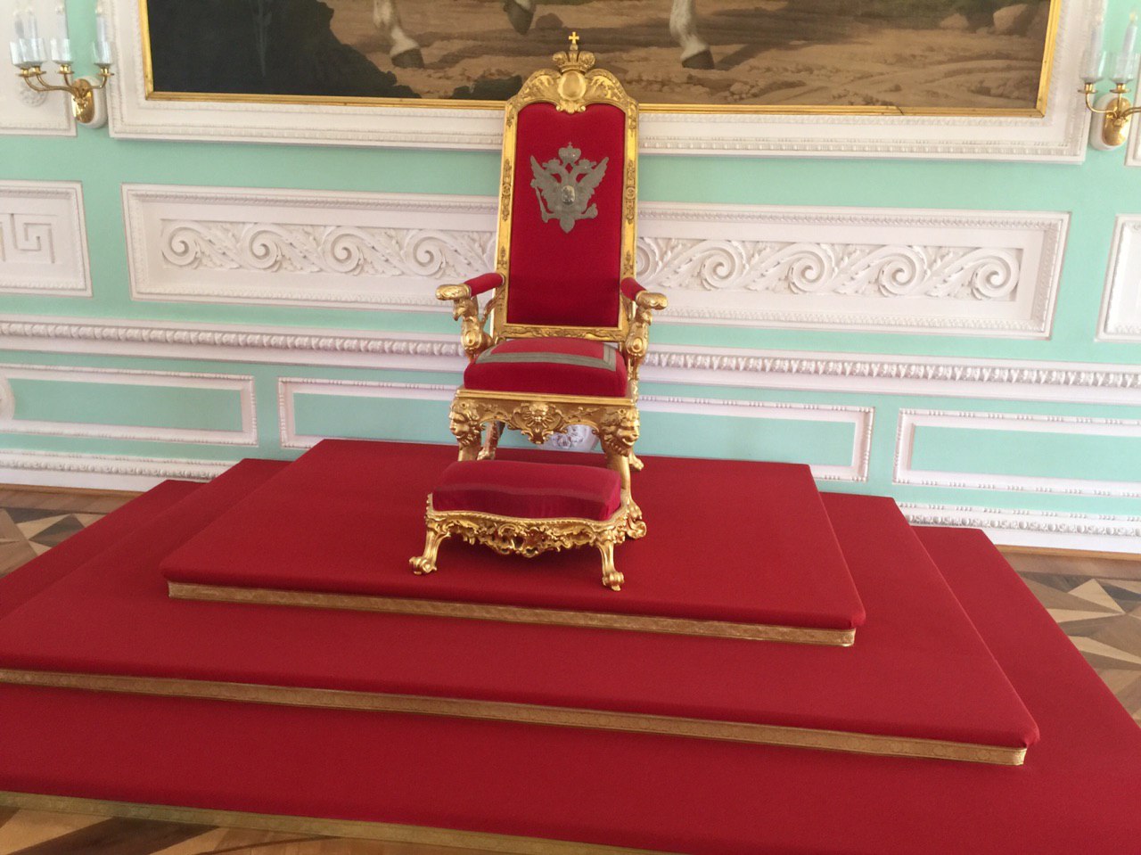 Dann beginnen wir unsere Besichtigung des Peters Palastes. Und ein weiteres Mal sind wir vom Prunk und der goldüberladenen Ausstattung dieses Palastes beeindruckt. Es ist recht entspannt. Unsere kleine Gruppe kann in Ruhe alle Räume betrachten und jeder bekommt seine Fotos. Es ist soviel zu sehen, dass wir am Ende fast nichts mehr aufnehmen können. So sind wir froh, dass es nun zum Mittagessen geht.