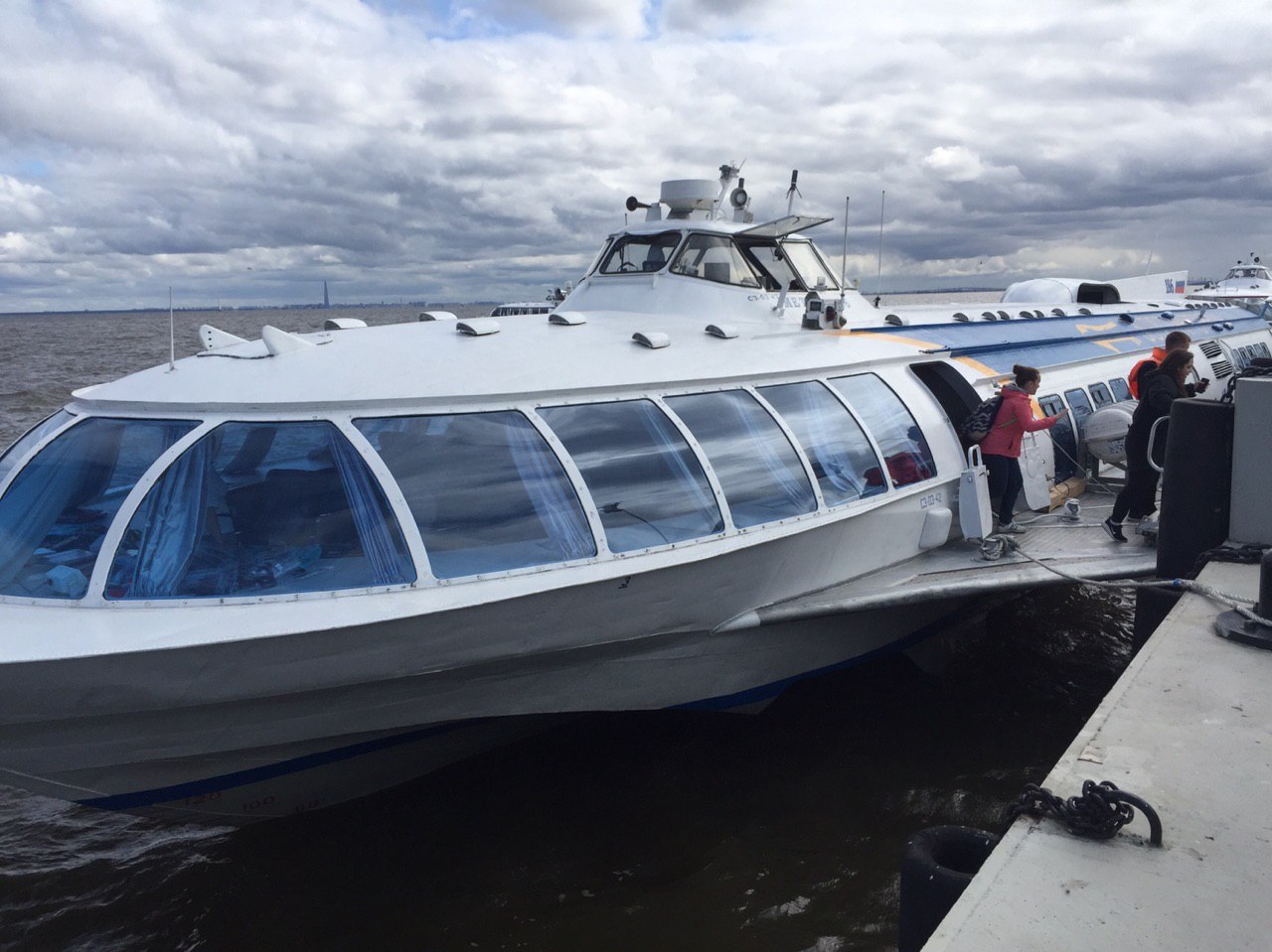 Wir fahren ins Zentrum von St. Petersburg an eine Anlegestelle an der Neva. Von dort geht’s mit einem Tragflügel Boot hinaus und über die große Bucht.