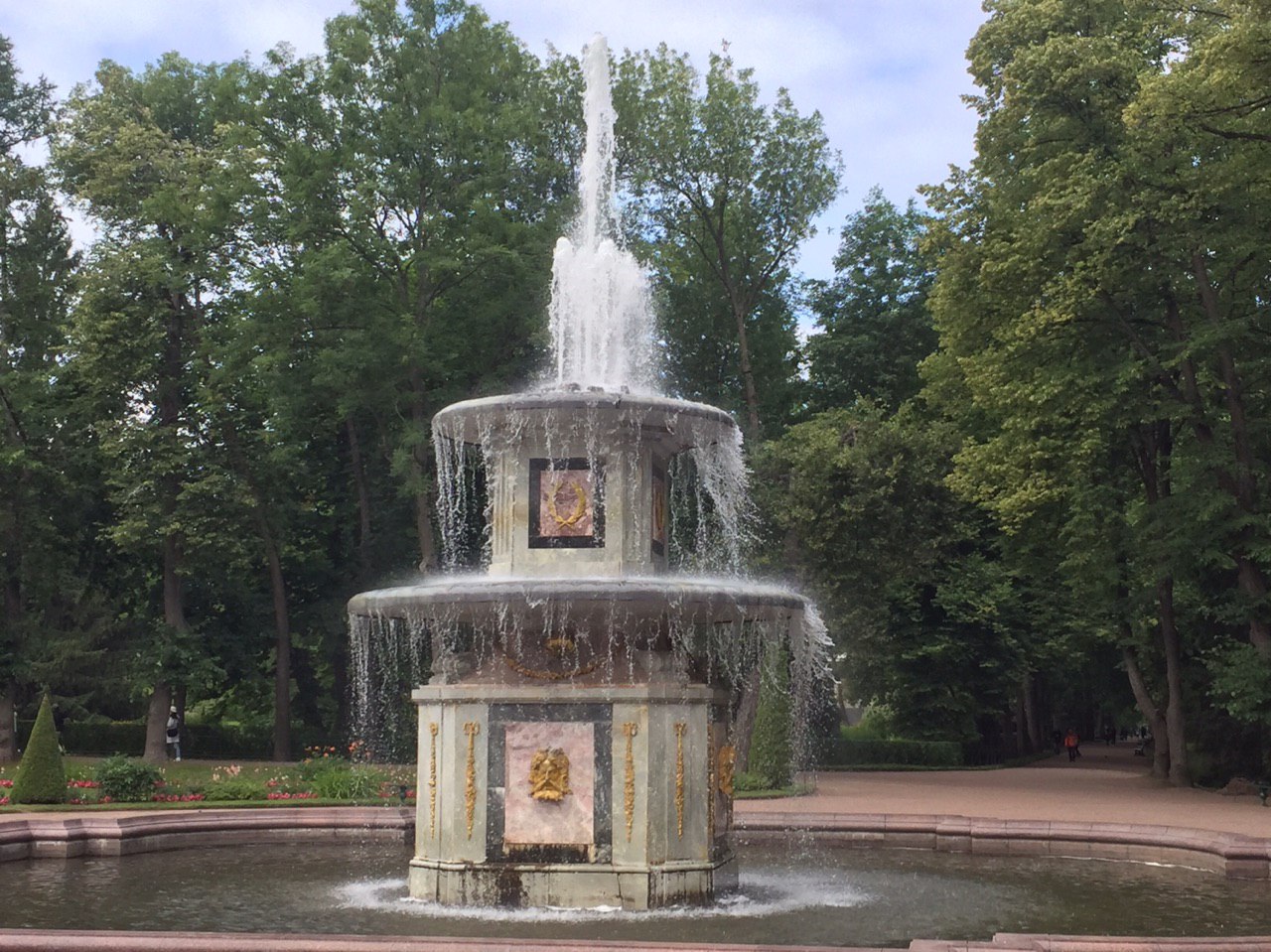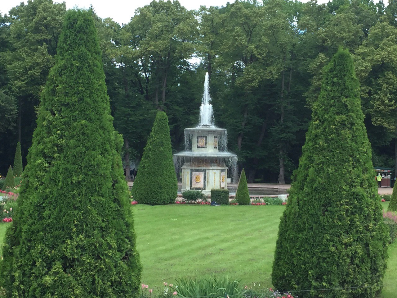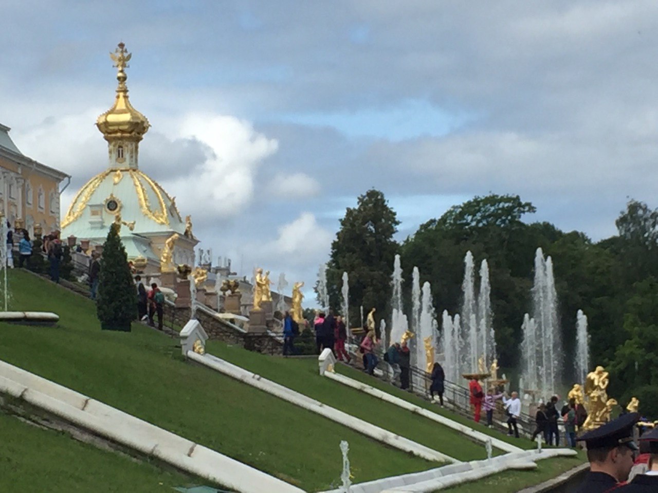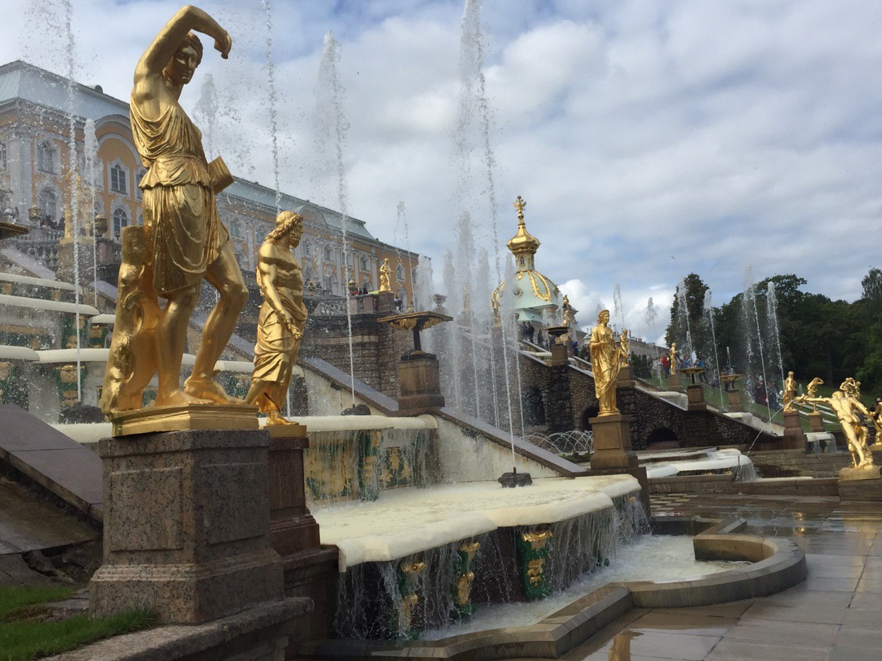 Gepflegte Beete und tausende blühende Blumen begeistern uns. Die vielen Palais erstrahlen in goldenem Glanz und die vielen Wasserkaskaden tanzen zur Musik.