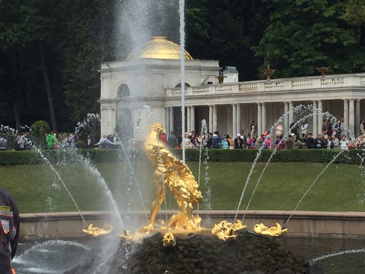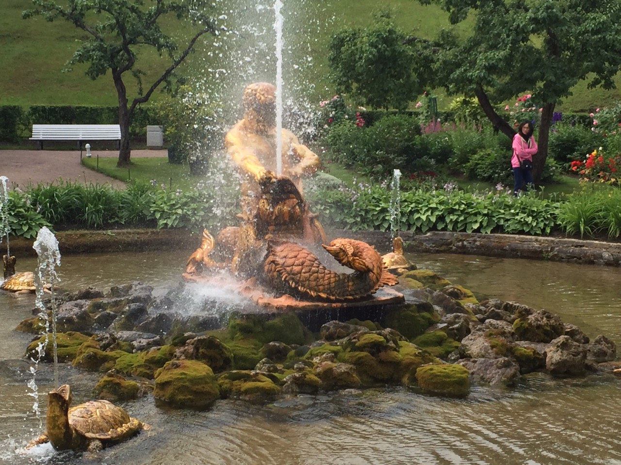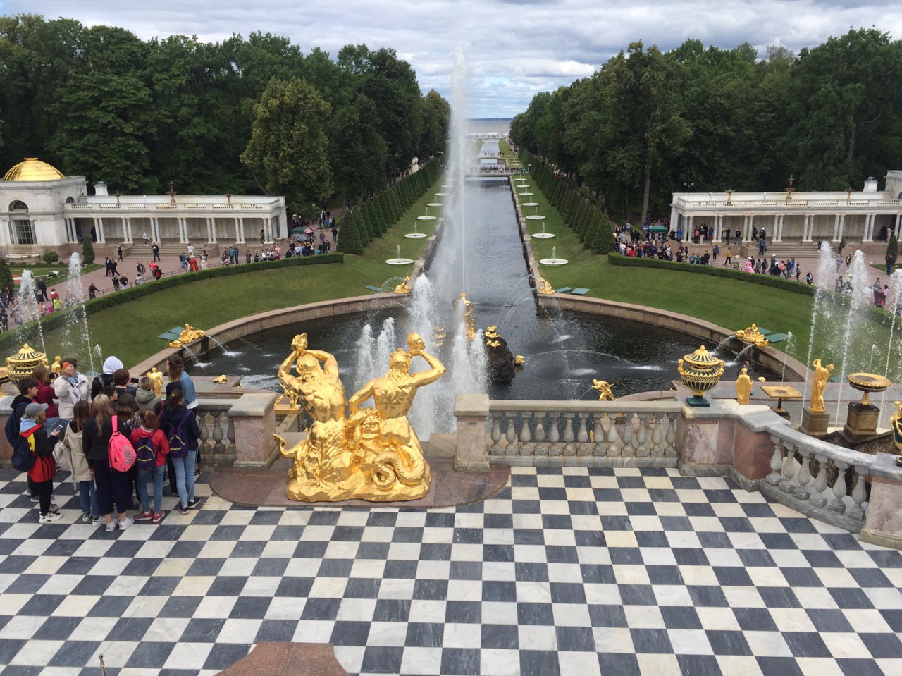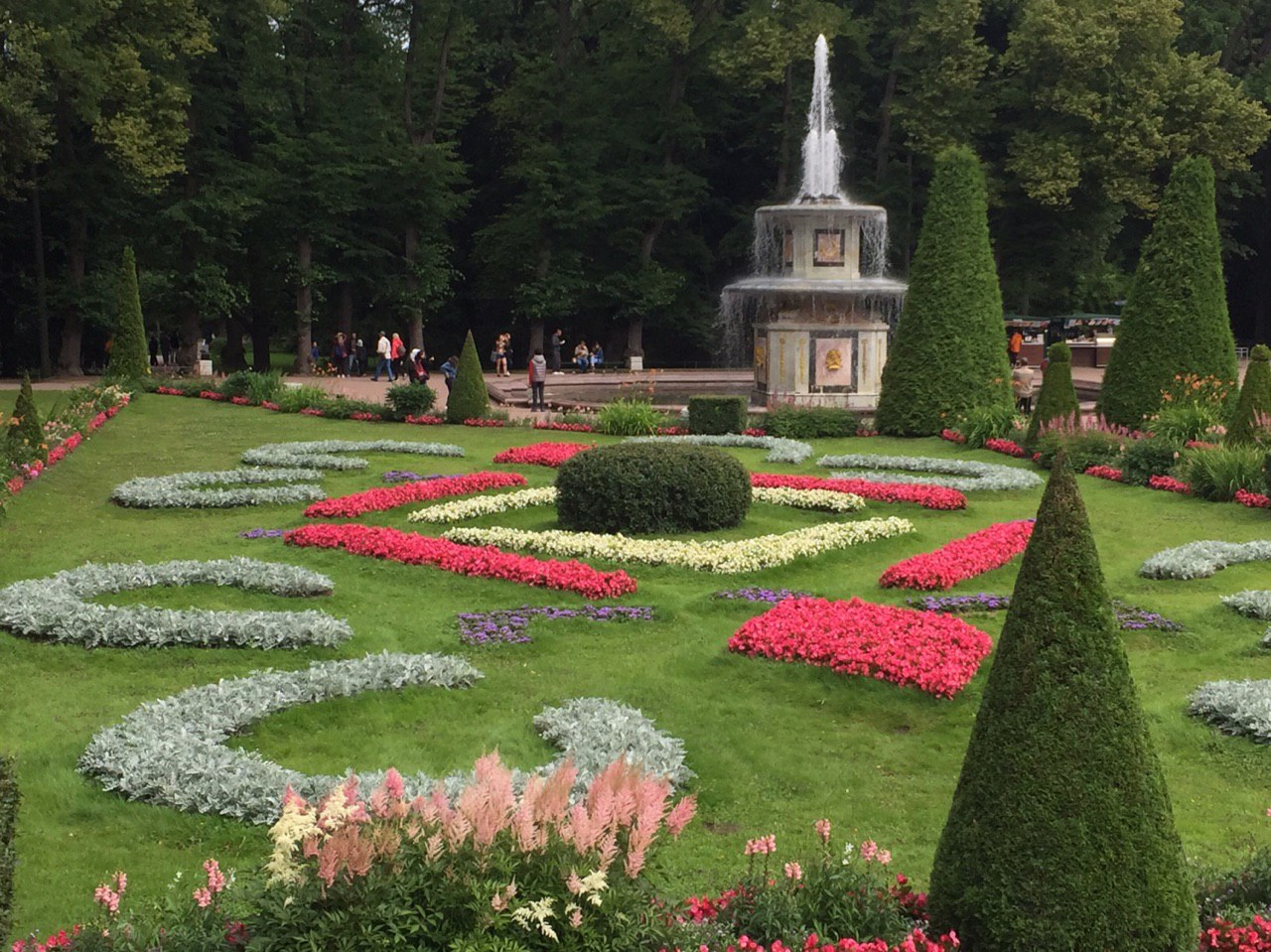 Gepflegte Beete und tausende blühende Blumen begeistern uns. Die vielen Palais erstrahlen in goldenem Glanz und die vielen Wasserkaskaden tanzen zur Musik.