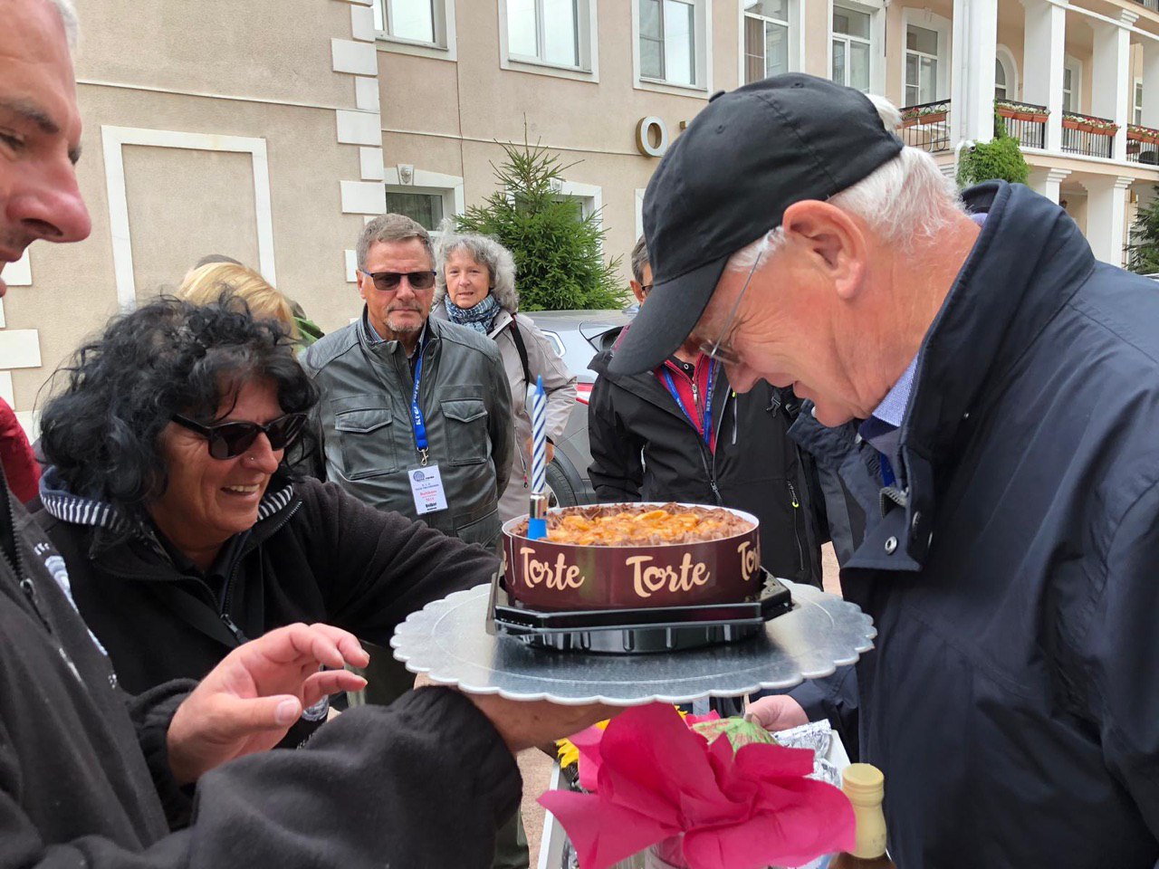 Bevor es heute los geht, haben wir uns erst einmal vor Dieters Wohnmobil verabredet. Er wird mit einem herzlichen Happy Birthday geweckt, wir überreichen ihm kleine Geschenke und lassen ihn hochleben!