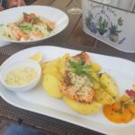 Währenddessen ist ein Gewitter aufgezogen. Markisen und Stühle werden eingeräumt und dann wird’s heftig nass. Es regnet, wie aus Kübeln.