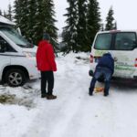 Nach einem umfangreichen Frühstück vom Buffet geht es an die Heimreise. Durch den Schneefall der vergangenen Tage ist bei der Abfahrt Unterstützung durch Schleppfahrzeuge erforderlich. Alle können den Platz mit diesem Service problemlos verlassen und die Heimreise antreten.