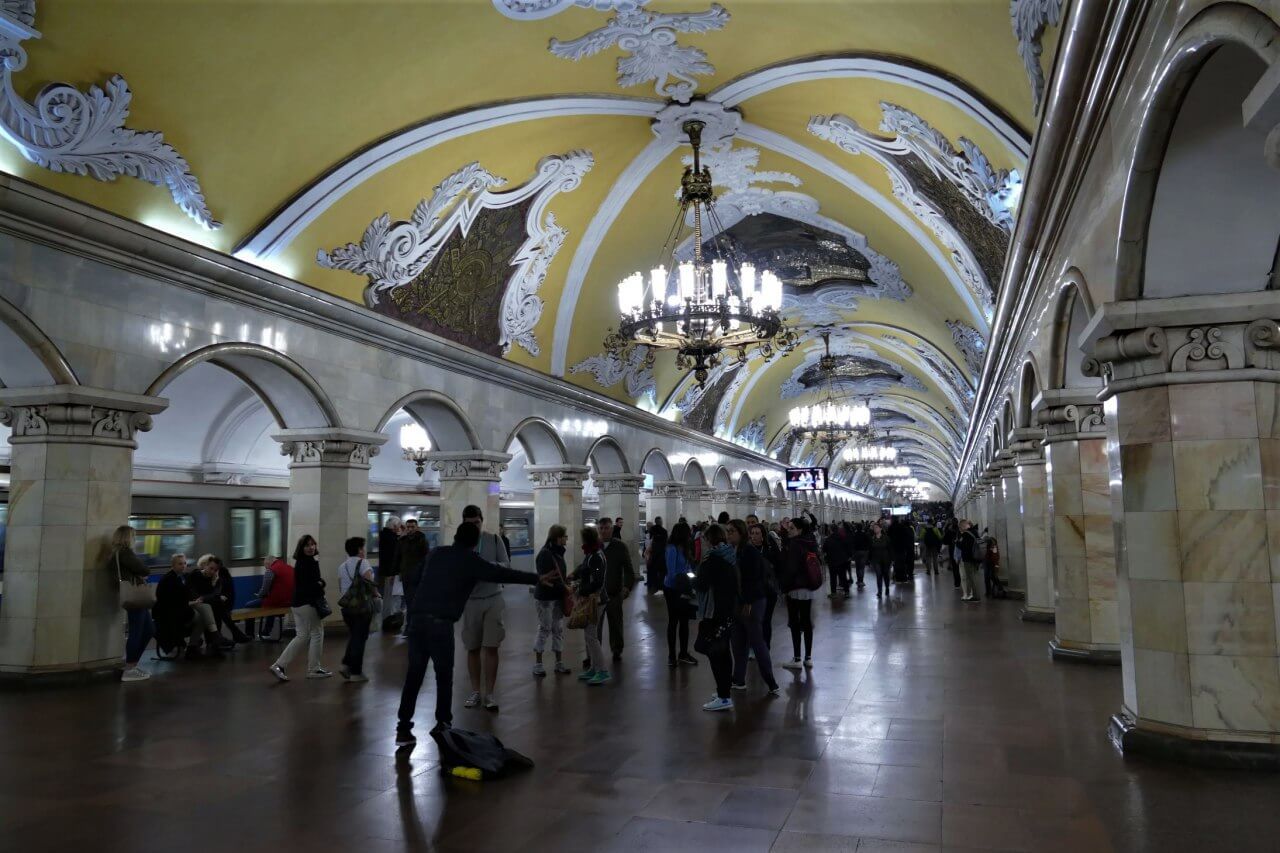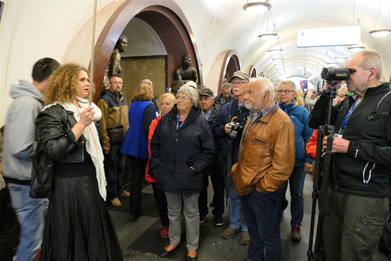 Unsere nächste Station ist die Moskauer Metro, eines der meist genutzten öffentlichen Verkehrsmittel der Welt und zugleich in tiefen Tunneln liegende palastartige Stationen, die über schnell laufende Rolltreppen erreicht werden. Wir fahren zu einigen der schönsten Stationen und erleben Moskau auch unter der Erde.