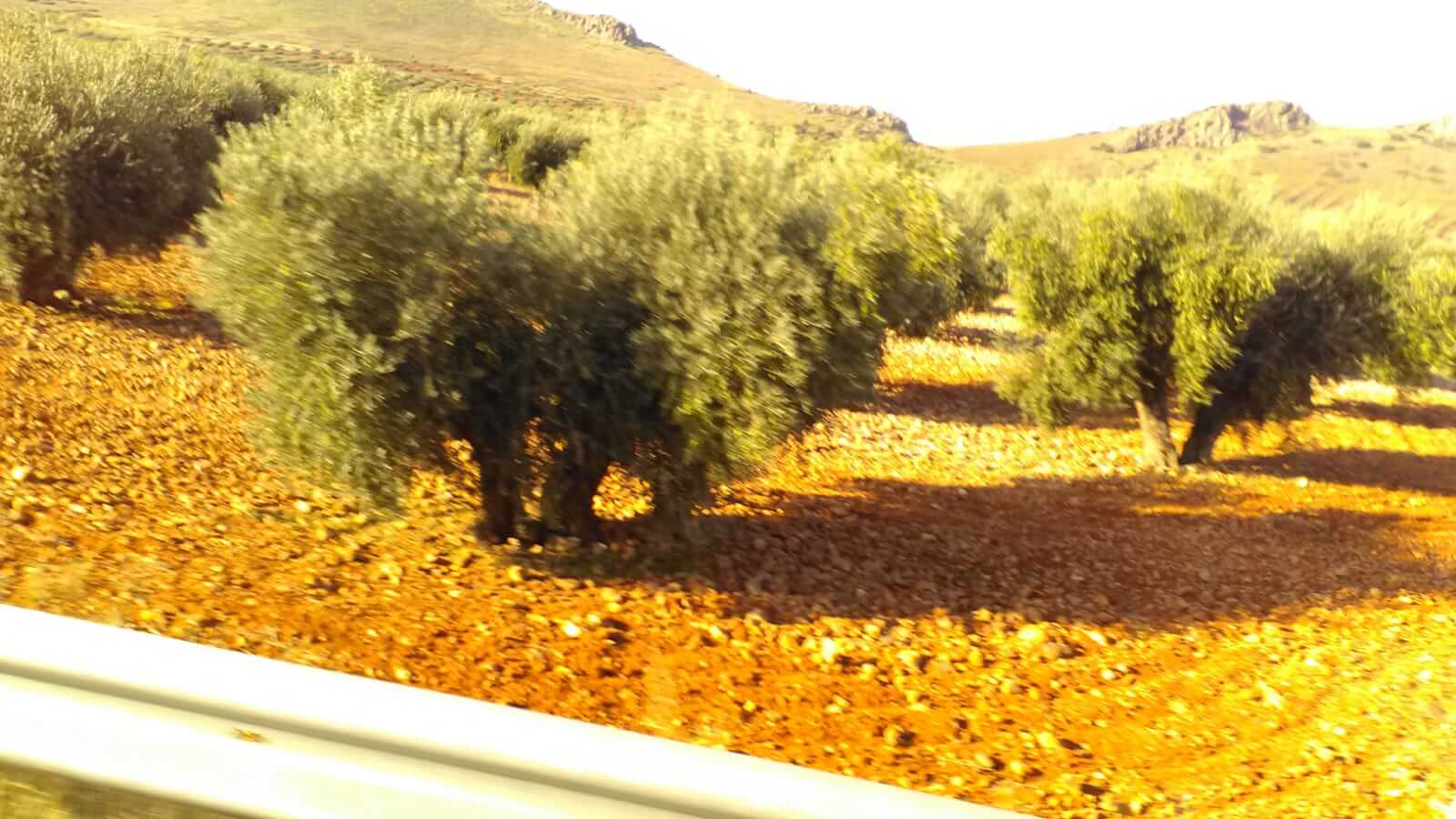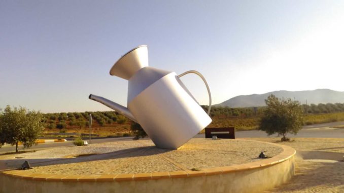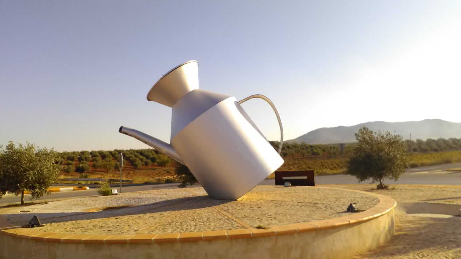 Und Olivenöl wird in diesem Gebiet hergestellt, benannt nach den Bergen hier, „Montes Toledo“. Viele Olivenhaine sehen wir rechts und links der Straße. Auf einem Kreisel überrascht als Wahrzeichen eine hübsche Ölkanne.