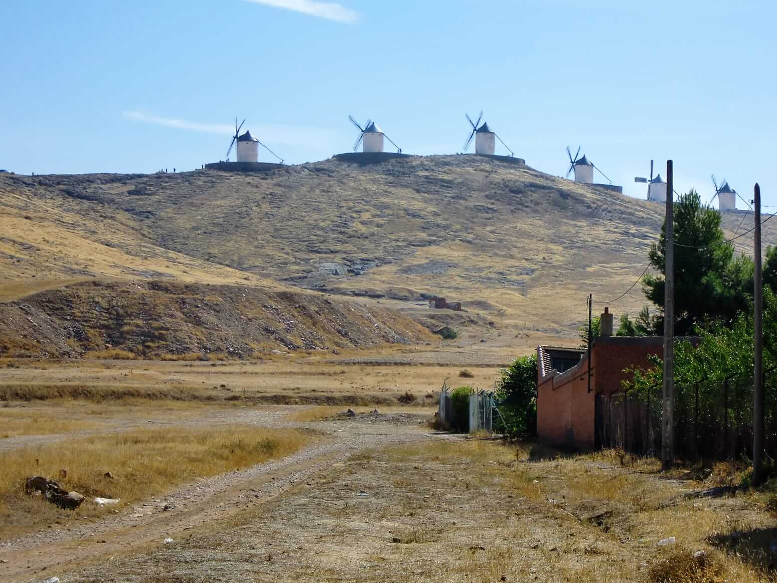 Das war das erste Ensemble, die Windmühlen von Campo de Criptana. Jetzt kommen die Mühlen von Consuegra. Vom Parkplatz muss man ein gutes Stück den Hügel hinauf marschieren, denn oben thront eine schöne Burg, attraktiv umgeben von den Mühlen.