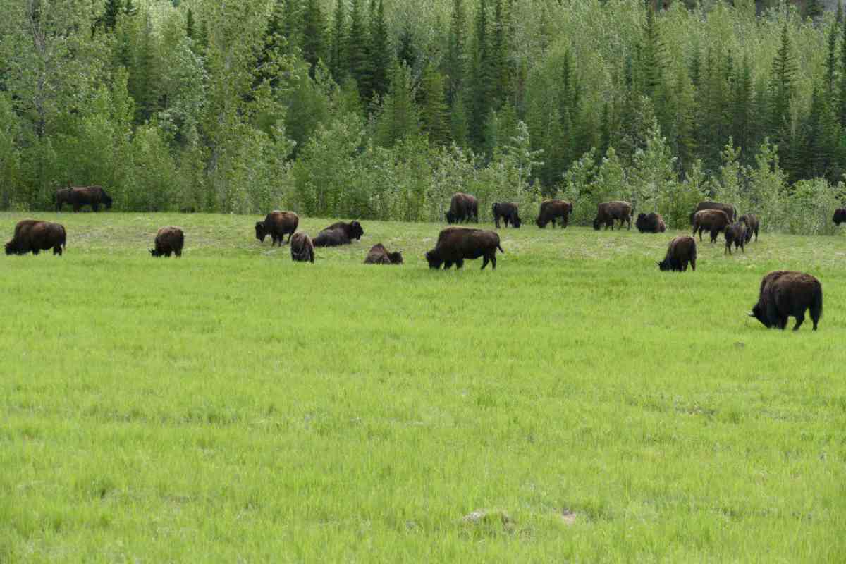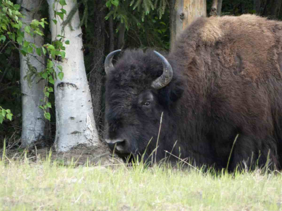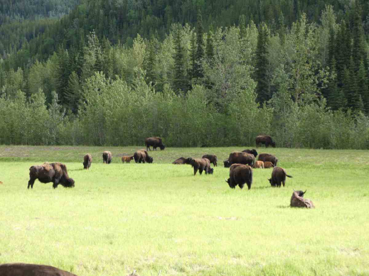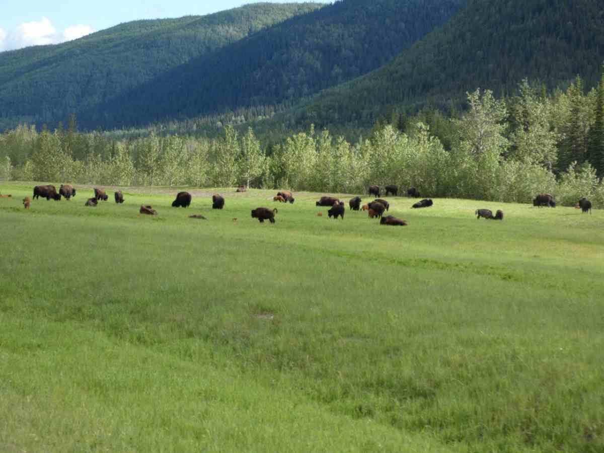 Fast auf der gesamten Strecke im Liard River Park begegnen und Bisonherden oder einzelne Bison-Paare mit mächtigen Tieren.