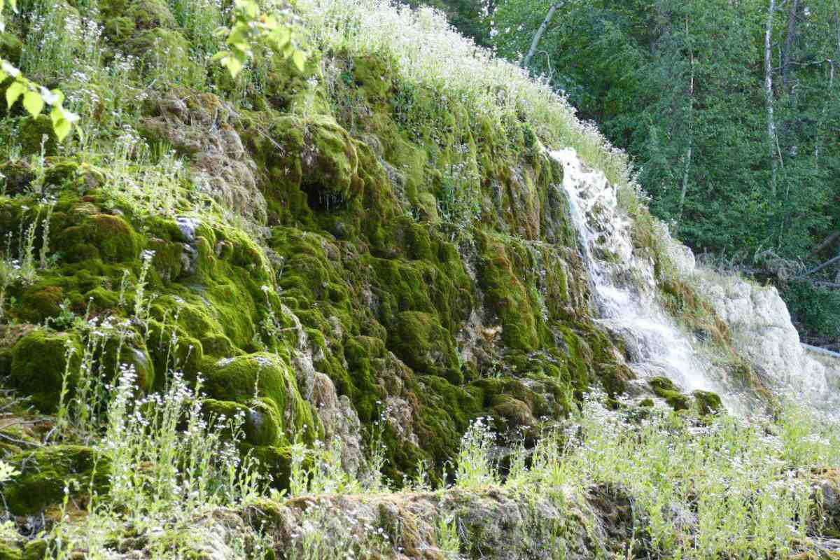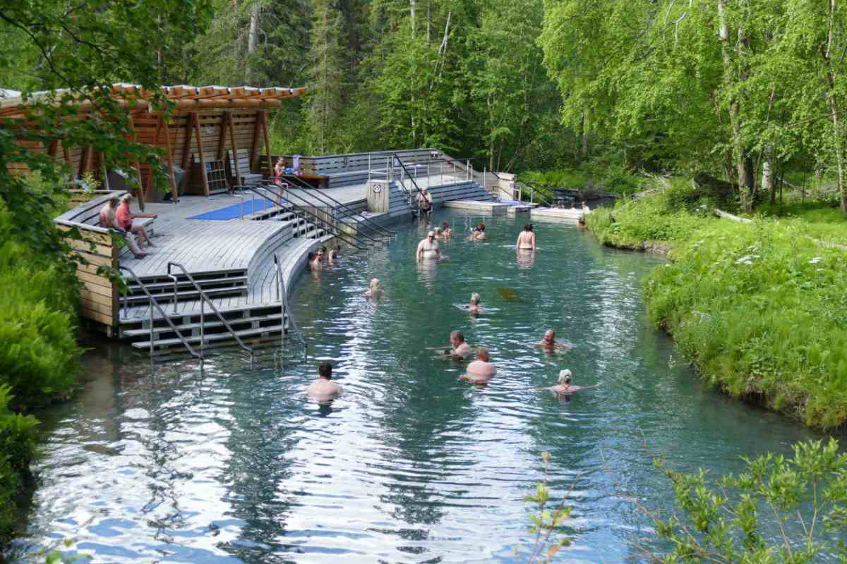 Wir verlassen unser Camp am Lake Muncho in Richtung Watson Lake. Auf dem Weg dorthin machen wir zu Fuß den kurzen Abstecher zu den Liard River Hotsprings. Im Alpha-Pool herrschen Temperaturen von bis zu 36°C. Einige nutzen das zu einem angenehmen Bad.