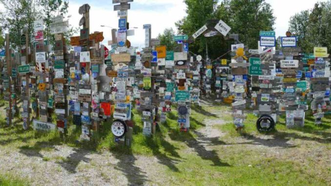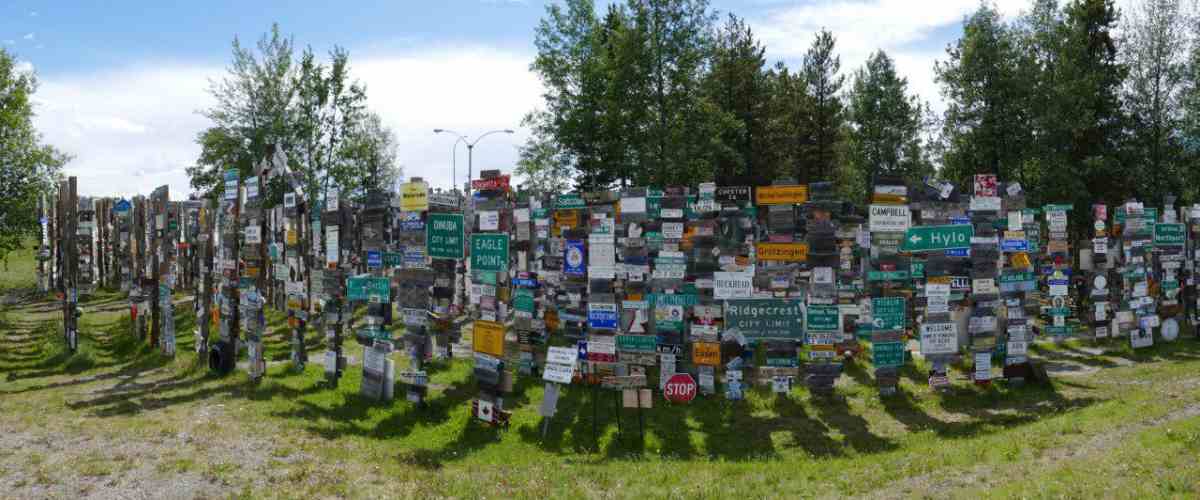 Beim Bau des Alaska Hkghways stellte ein amerikanischer Soldat wegen Heimweh in Watson Lake ein Straßenschild aus seiner Heimat auf. Andere folgten und Stand September 2018 wurden mittlerweile 88.186 Schilder aus aller Welt aufgestellt, darunter auch viele Schilder aus Deutschland und Österreich. Ein regelrechter Schilderwald!