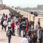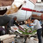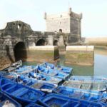 Im Fischereihafen von Essaouira, der geschützt außerhalb der Stadtmauer liegt, werden die blauen Schiffe noch heute ganz traditionell aus Holz gefertigt. Man kann die Fischer beobachten wie sie ihre Netze flicken.