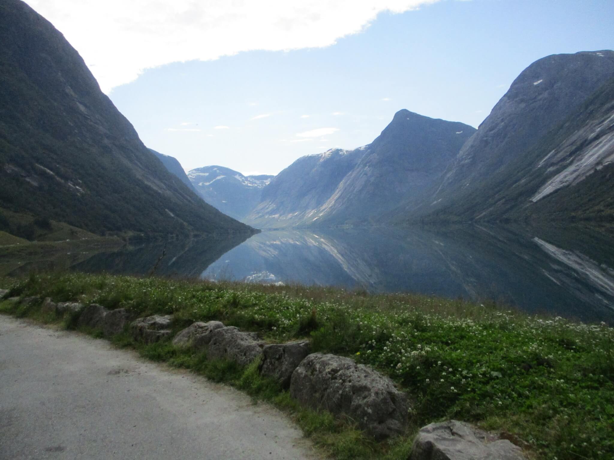 Viele Tunells, teils recht dunkel „gespenstigste“ durchfuhren wir heute. Entlang des Sognefjordes erwarten uns wunderschöne Landschaftseindrücke, die uns zum Teil an oberitalienische Seen erinnerten – Wasser und steil ansteigende Berge-. 2 mal setzen wir in kleinen Fähren über den Fjord, einmal bei Larvik, das 2. Mal nach dem schönen Ort Balestrand bei Hela. Nach weiterer Fahrt in die „Berge“ , erreichten wir unser heutiges Ziel, das Camp Boyum. Von hier aus sehen wir einen der Gletscher, es werden morgen noch einige folgen. Neben unserem Campingplatz befindet sich der Gletscher und Klimamuseum.
