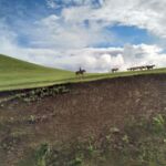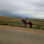 Die Straße in die alte Hauptstadt ist für mongolische Verhältnisse gut, so dass wir unseren Treffpunkt pünktlich erreichen. Von dort geht es in gemeinsamer Fahrt zu unserem Camp in die grasbewachsenen Steppe. Langsam ahnt man die Größe der Mongolei- immerhin mehr als vier mal so groß wie Deutschland – und merkt auch, dass die Mongolei der am dünnsten besiedelte Staat der Welt ist.