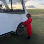 Am morgen vor unserer Abfahrt zum Nationalpark in der Nähe von Ulaanbaatar verabschiedete uns unsere kleine Mongolin mit guten Wünschen für unsere Reise und weihte unsere Womo’s für eine gute Fahrt.