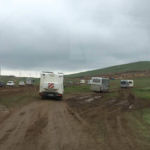 Nachdem wir gestern 5 Nebenwege mit zusammen etwa 50 km geschafft hatten, stehen uns heute in den verbleibenden 50 km bis Darchan noch etwa 20 km davon bevor. Das sind aber die schlimmsten mit Senken (Löchern), in denen das Womo bis zum Dach verschwindet und Schlammstrecken, die ihre Spuren bis zum Dach zeichnen.