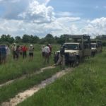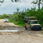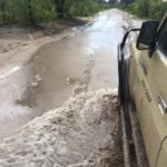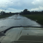 Wir schließen die Seitenwände der Jeeps und schon prasselt es so richtig vom Himmel herab. Aus den kleinen Wasserlöchern werden große und aus den Großen…. tiefe!