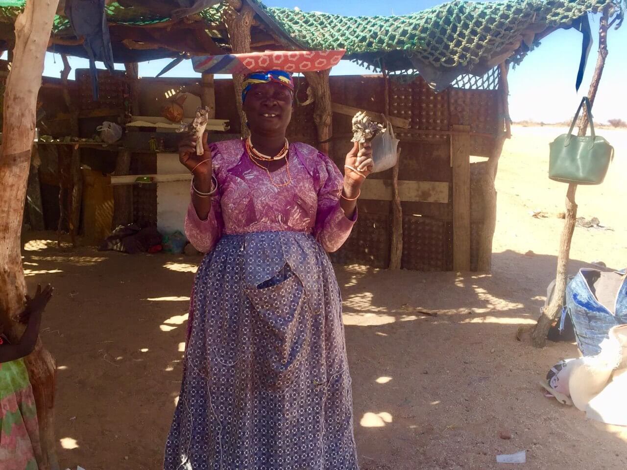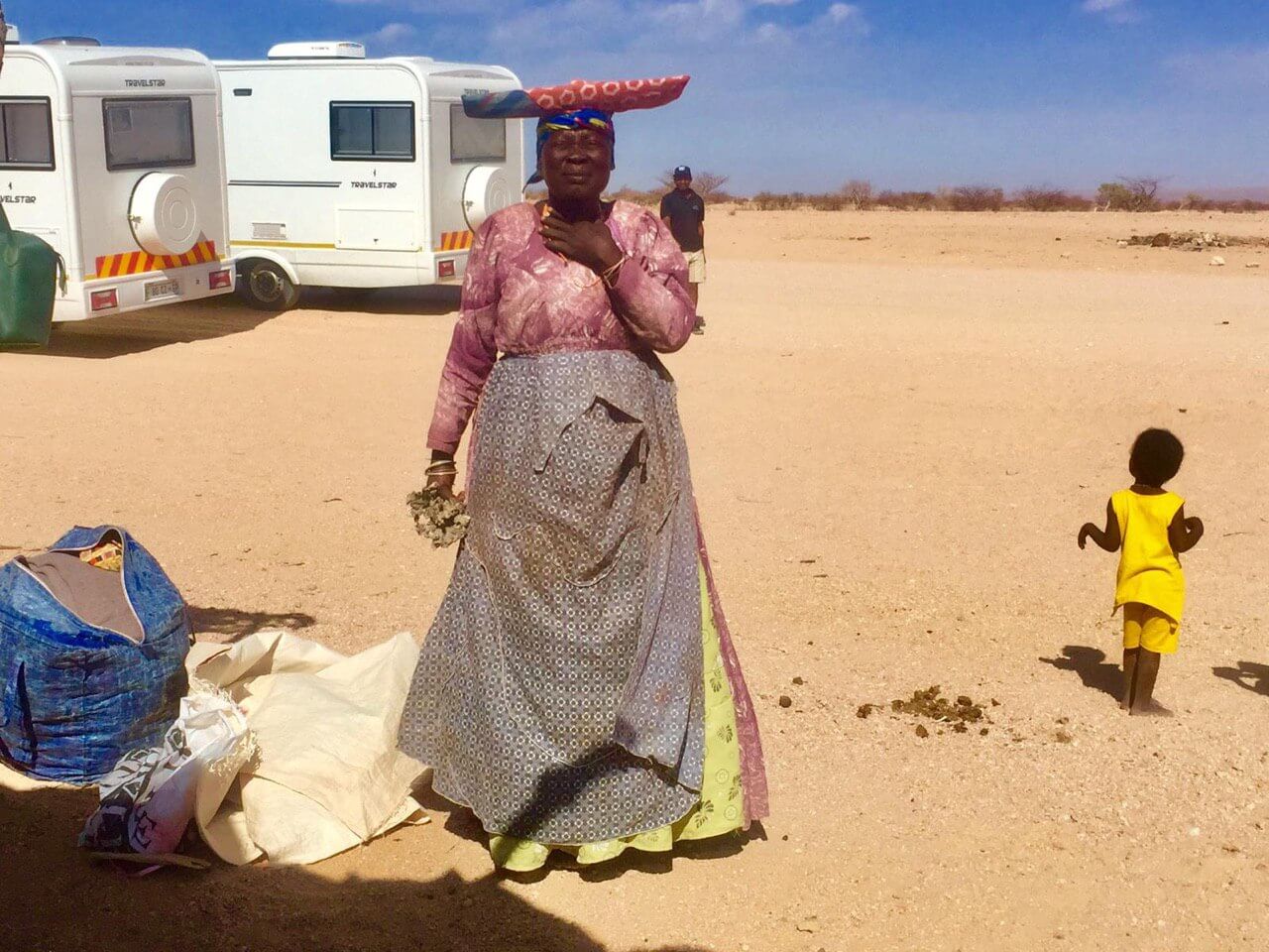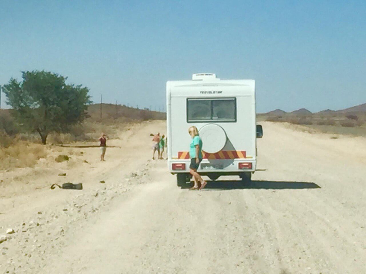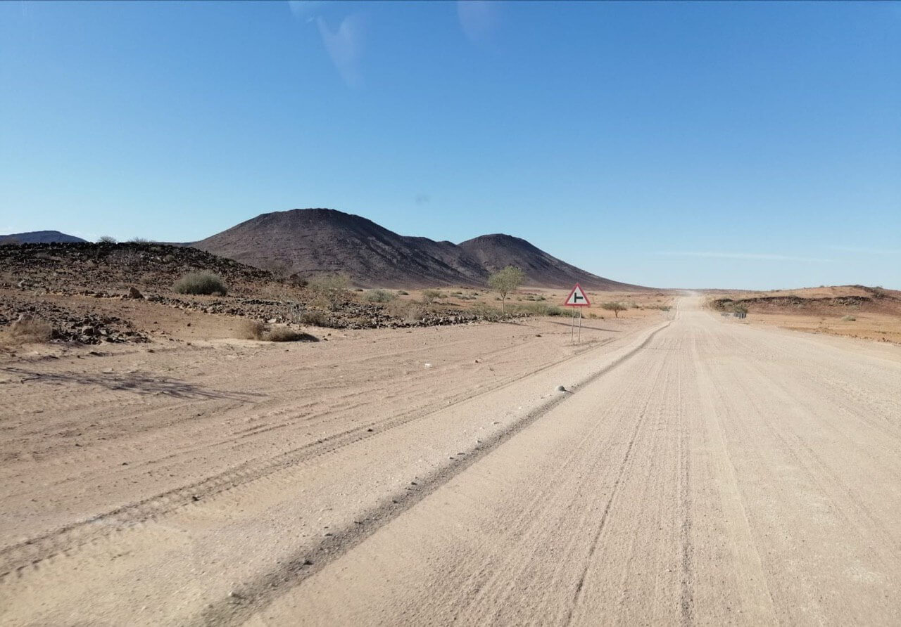 Nach dem genussvollen Sundowner gestern, steht heute wieder eine lange Schotterpiste auf dem Programm. Die ersten 8 km sind noch Teer, dann biegen wir ab und sind sehr gespannt, in welchem Zustand die Piste wohl sein mag. Zu unserer Freude ist sie in recht gutem Zustand. Jeder fährt seine Geschwindigkeit, so, wie er am besten klar kommt. Unterwegs sehen wir noch ein paar Himba Stände und halten an. Wir kaufen noch ein paar Andenken und Geschenke für die Lieben zu Hause.