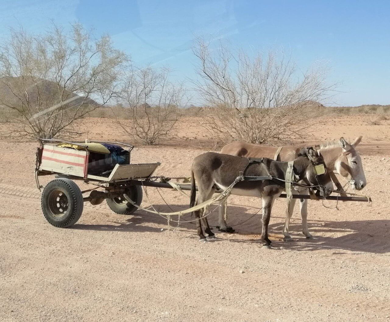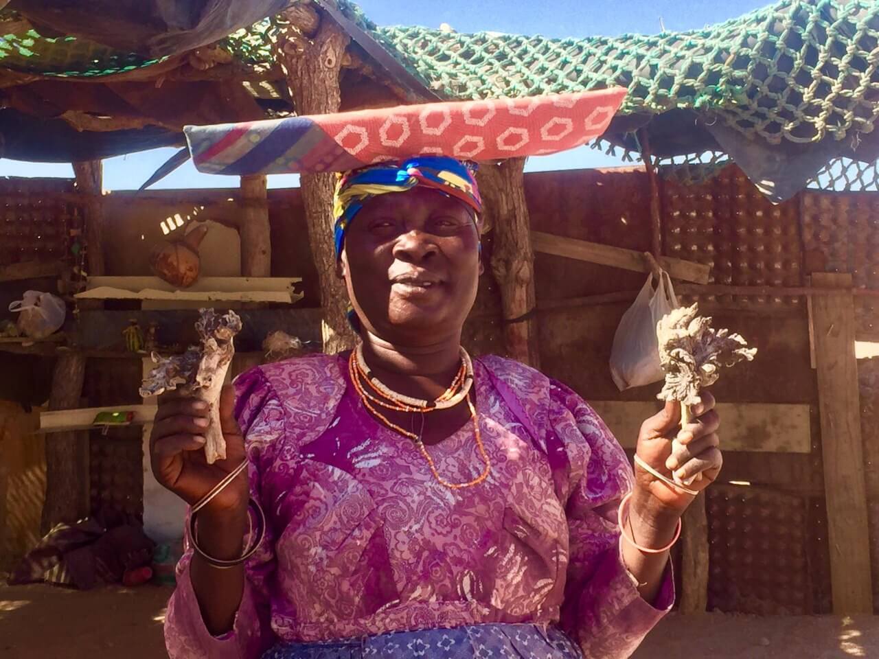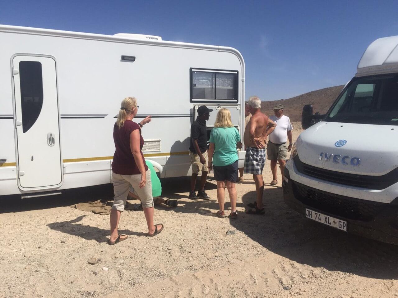 Nach dem genussvollen Sundowner gestern, steht heute wieder eine lange Schotterpiste auf dem Programm. Die ersten 8 km sind noch Teer, dann biegen wir ab und sind sehr gespannt, in welchem Zustand die Piste wohl sein mag. Zu unserer Freude ist sie in recht gutem Zustand. Jeder fährt seine Geschwindigkeit, so, wie er am besten klar kommt. Unterwegs sehen wir noch ein paar Himba Stände und halten an. Wir kaufen noch ein paar Andenken und Geschenke für die Lieben zu Hause.