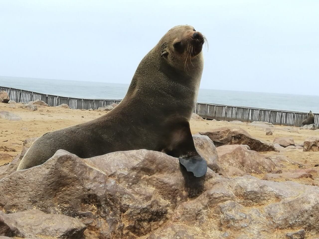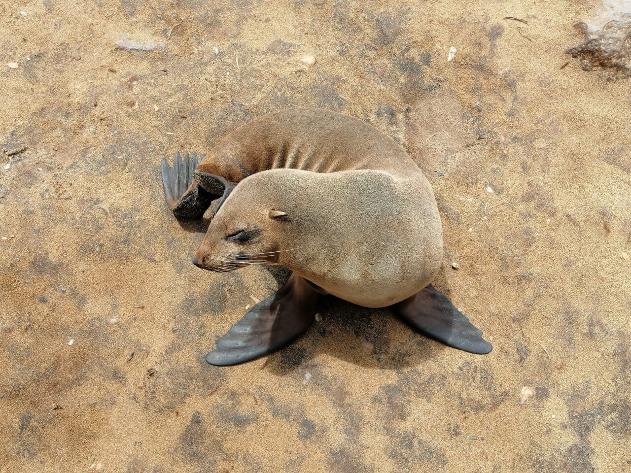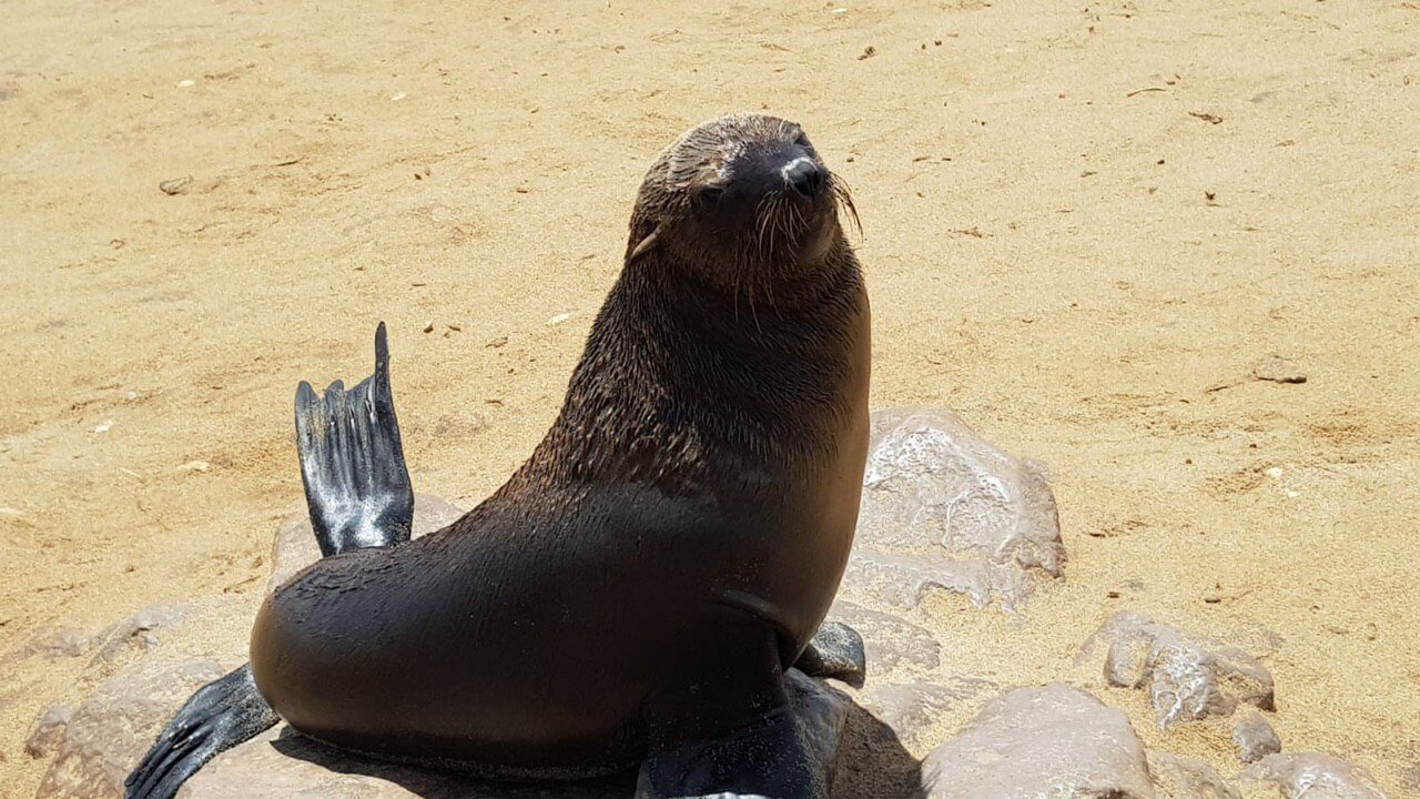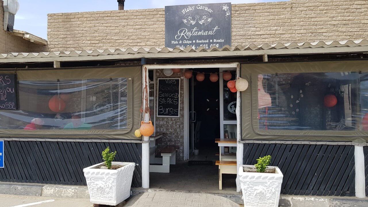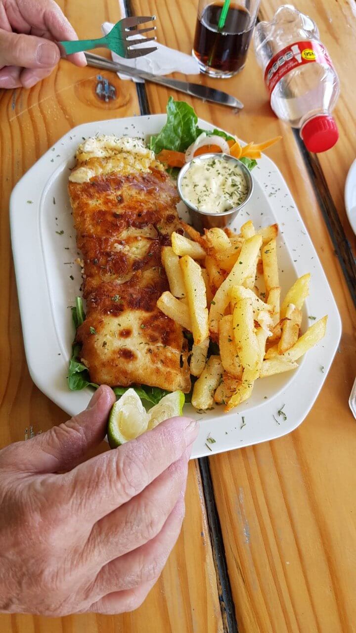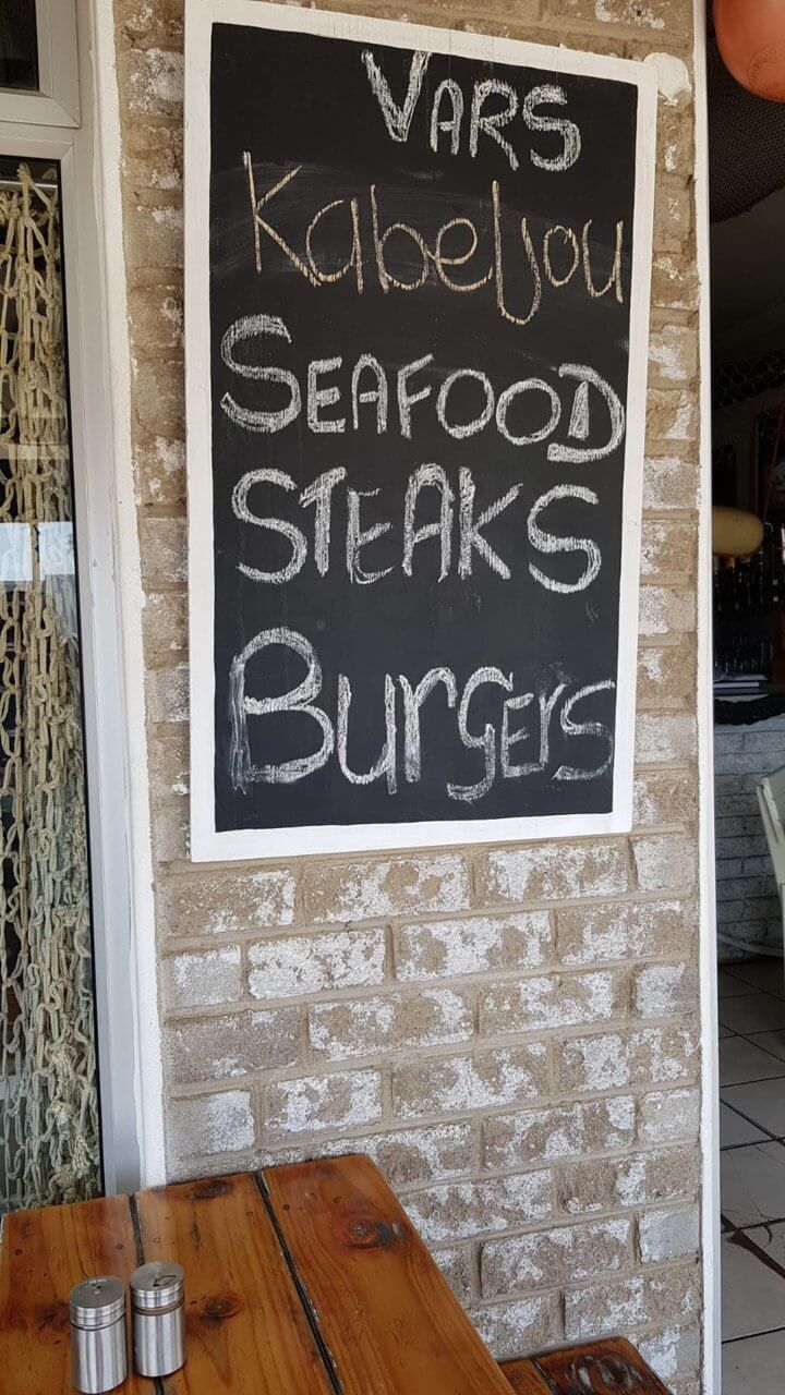 Es geht zurück südwärts. Wir passieren wieder die Piste, die uns zum Meer gebracht hat. Nun fahren wir immer entlang der Küste. Ein kleiner Ort, Henties Bay, lädt zu einer mittäglichen Fischmahlzeit ein! Lecker! Kabeljau, Calimari und ähnliche Gerichte locken.