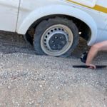 Eigentlich ist sie ganz gut zu fahren. Doch kaum haben wir die ersten km absolviert, bekommen wir eine Info: … Plattfuß etwa 20 km voraus.