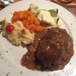 Am Abend gehen wir gemeinsam zum Abendessen. Es gibt im Schützenhaus etwas typisch Deutsches! Rindsroulade mit Kartoffelpüree, Karotten und Broccoli.