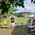 Wir stehen alle nah beieinander auf einer Wiese. Die Begrüßung startet etwas später als geplant, weil wir noch auf einige Verspätete warten wollen.