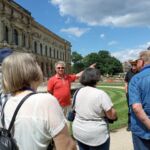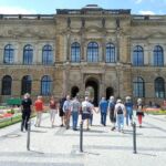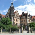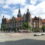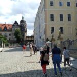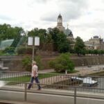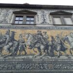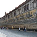Weiter geht’s vorbei am „Grünen Gewölbe“, dem Museeum, in dem Kunstgegenstände von enormem Wert beherbergt sind. Man erinnere sich an den skandalösen Juwelenraub vor einigen Jahren! Von hier haben wir noch einen schönen Blick zur Semperoper! Und nun stehen wir vor der Schloßmauer, auf der aus Tausenden von Porzellanfliesen der berühmte „Fürstenzug“ mit den Herrschern des Hauses Wettin abgebildet ist. Hoch zu Ross erkennt man hier auch August den Starken.