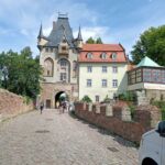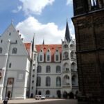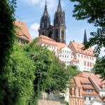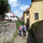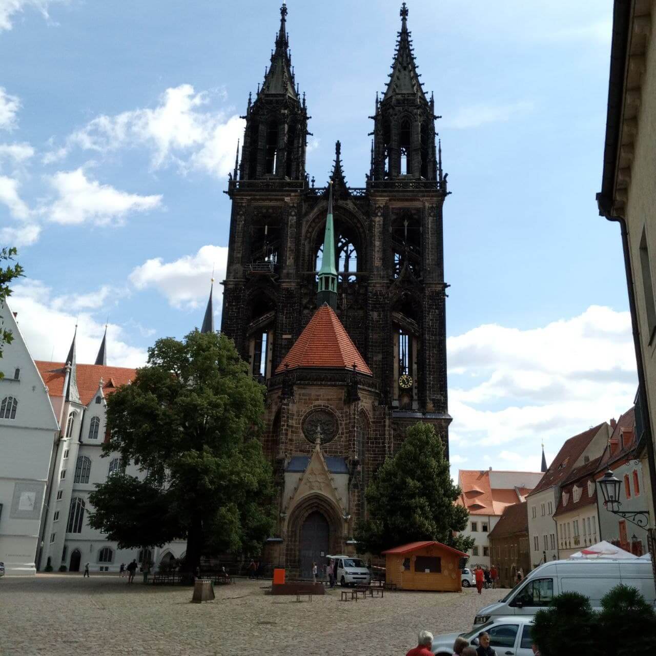 Fotos werden geschossen, die Ansicht genossen und weiter geht’s nach Meissen. Diese kleine, aber feine und geschichtsträchtige Stadt bildete sich aus der bereits im Jahre 929 von Heinrich l. errichtete Festung auf dem Burgberg. Am Fusse dieses Burgbergs hält unser Bus, und wir können im funktionierenden Fahrstuhl den steilen Hang hinauf zur Stadt gelangen. Wieder haben wir Glück mit einer supernetten Stadtführerin, die uns mit viel Humor und Liebe zu ihrer Stadt die Sehenswürdigkeiten aufzeigt und erklärt. Zu der Erhaltung der historischen Gebäude, die teilweise zu DDR-Zeiten aus Mangel an Mitteln nicht gepflegt oder erneuert wurden, sondern dastehen wie eh und je, macht sie eine Ausage, die hörenswert ist: „Armut ist der beste Denkmalschutz!“ Gleich zu Beginn der Führung stehen wir vor dem 150jaehrigen gotischen Dom. Dahinter erhebt sich die Albertsburg, das ehemalige Bischofsschloss, das als Profanbauwerk der Spätgotik fast ein wenig modern wirkt.