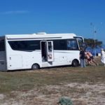 Beim Versuch, näher am Strand zu stehen, hat sich eines unserer Fahrzeuge festgefahren. Es werden Bretter, Platten und Schaufeln herbeigebracht. Mit vereinten Kräften bekommen wir das Fahrzeug bald wieder flott.