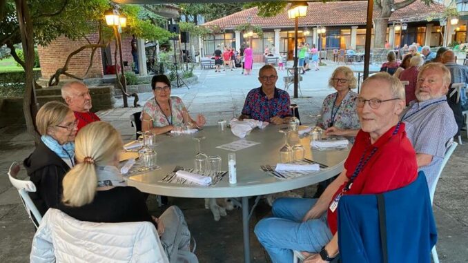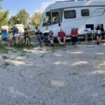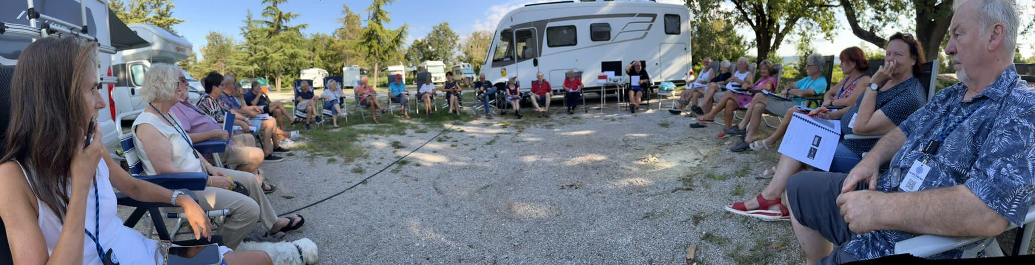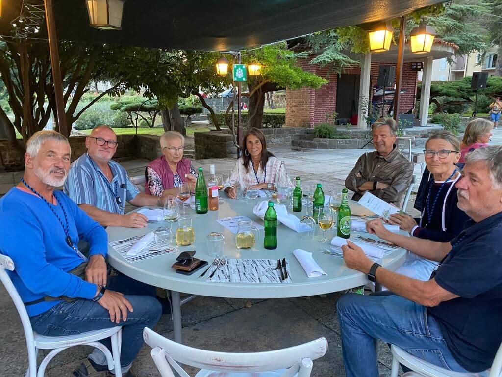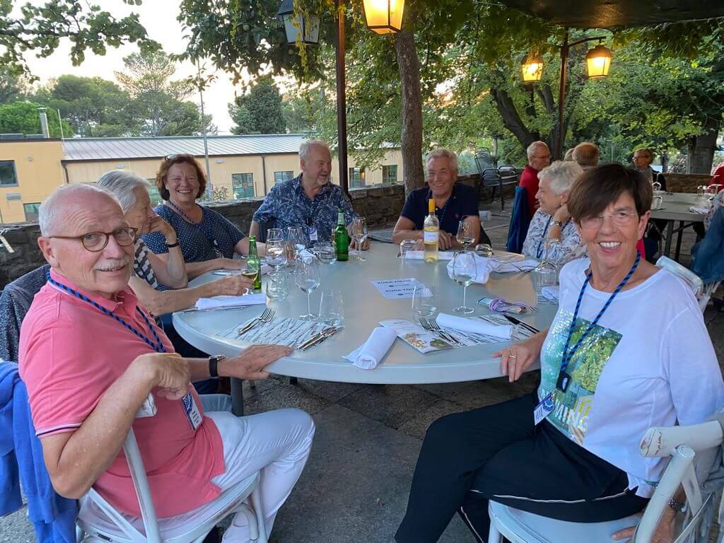 Da der Weg von Deutschland nach Slowenien doch Zeit erfordert sind einige schon ein paar Tag eher auf unserem CP angereist um vor dem offiziellen Start der Tour bereits das Urlaubsfeeling an der Adria zu genießen und sich von der langen Anreise zu erholen. Andere bewältigten als letzte kurze Etappe die Anreise vom KUGA- Kundentreffen auf Cres nach Slowenien in wenigen Stunden. Am Nachmittag waren alle vor Ort, so dass wir pünktlich mit dem ersten Kennenlernen und dem Austausch unserer Erwartungen und Wünsche für diese Reise beginnen konnten. In der ersten Teilnehmerberatung gab es dann vom Reiseleiter noch einige Hinweise und wir verständigten uns, wie wir unsere gemeinsame Reise so gestalten wollen, dass sie für alle ein unvergessliches Erlebnis wird. Das Kuga-Equipment für die Reise wurde ausgegeben und danach besprachen wir schon den ersten Fahrtag der Reise. Am Abend trafen sich alle im Restaurant des CP um mit großem Appetit unser Begrüßungsessen zu genießen. Dieses war so vorzüglich, dass von Allen ein Lob an die Küche ging. Der Abend mit slowenischen Fischspezialitäten und die exzellente musikalische Darbietung von einem „Erben“ des oberkrainischen Sounds wurde zu einem wundervollen Starterlebnis unserer Reise.