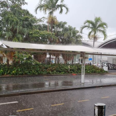 Heute ist ein guter Tag! Auch alle Einreise Formalitäten in Australien laufen sehr zügig und so sind wir bereits weit vor der geplanten Zeit mit allem fertig. Die Wartezeit bis unser Shuttlebus eintrifft, verbringen wir mit einem Kaffee in der Abfertigungshalle. Wir richten gleich mal unsere australischen Telefonkarten ein. Draußen prasselt heftig der Monsunregen nieder.