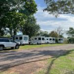 Heute steht unser Shuttlebus überpünktlich vor dem Hotel. Der freundliche Fahrer holt unser Gepäck sogar im Hotel ab und lädt es gleich ein. Klasse! Dann geht’s los. Nur wenige Kilometer sind es bis zur Vermietstation. Als wir ankommen sehen wir sofort unsere bereitgestellten Fahrzeuge. Doch zuerst der langweilige Papierkram. Corona hat schon Veränderungen mit sich gebracht. Früher wurde die Gruppe gemeinsam in einen Raum geführt und man sah sich den Einführungsfilm über die Wohnmobile und ihre Handhabung gemeinsam an. Heute muss jeder eine App runterladen und dann für sich allein ein Video schauen oder die Handhabung lesen. Dann ist alles erledigt. Die Fahrzeuge werden übergeben. Alle sind sehr positiv überrascht. Recht neue Fahrzeuge bekommen wir, sauber und in gutem Zustand. Die Reiseleiter bekommen ein etwas älteres Fahrzeug, jedoch auch in gutem Zustand. Wir räumen den Inhalt unserer Koffer in die Schränke und dann geht’s los. Bald schon treffen wir uns am nächsten Supermarkt wieder. Wir erledigen unsere Grundeinkäufe und fahren gleich weiter zum ersten Campingplatz unserer Reise. Bei Walter und Rosi ist gleich die Badezimmertür herausgefallen. Sogleich kommen 2 Jungs von der Vermietstation angefahren, reparieren die Tür und bringen uns zum Ausgleich für das ältere Fahrzeug noch einen Grill und Holzkohle mit! Sehr nett!!! und wir freuen uns auf schöne Campertafeln. Unsere Fahrerbesprechung machen wir am Abend bei immer noch 32°C. Dann kehrt Ruhe ein. Müde von der Hitze, der hohen Luftfeuchtigkeit und den Geschehnissen des Tages kümmern wir uns um Abendessen, Duschen und sich weiter im Wohnmobil einrichten.