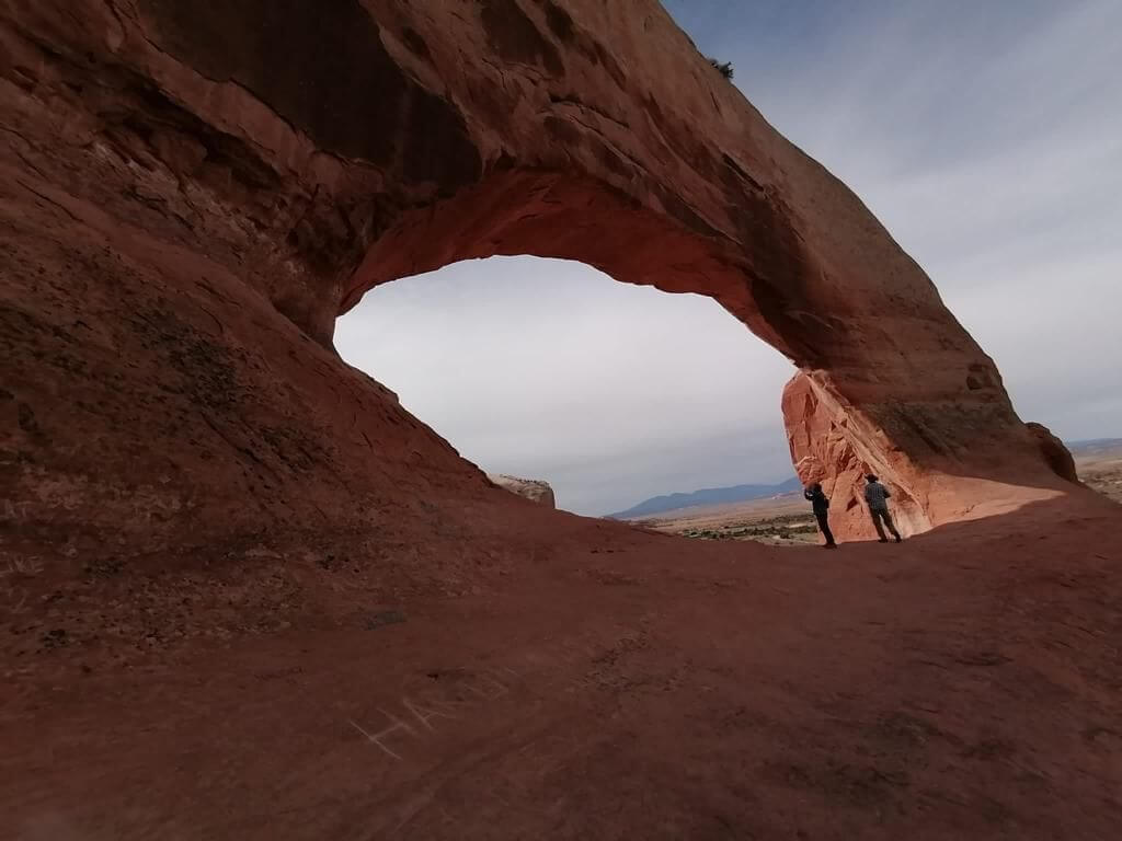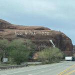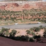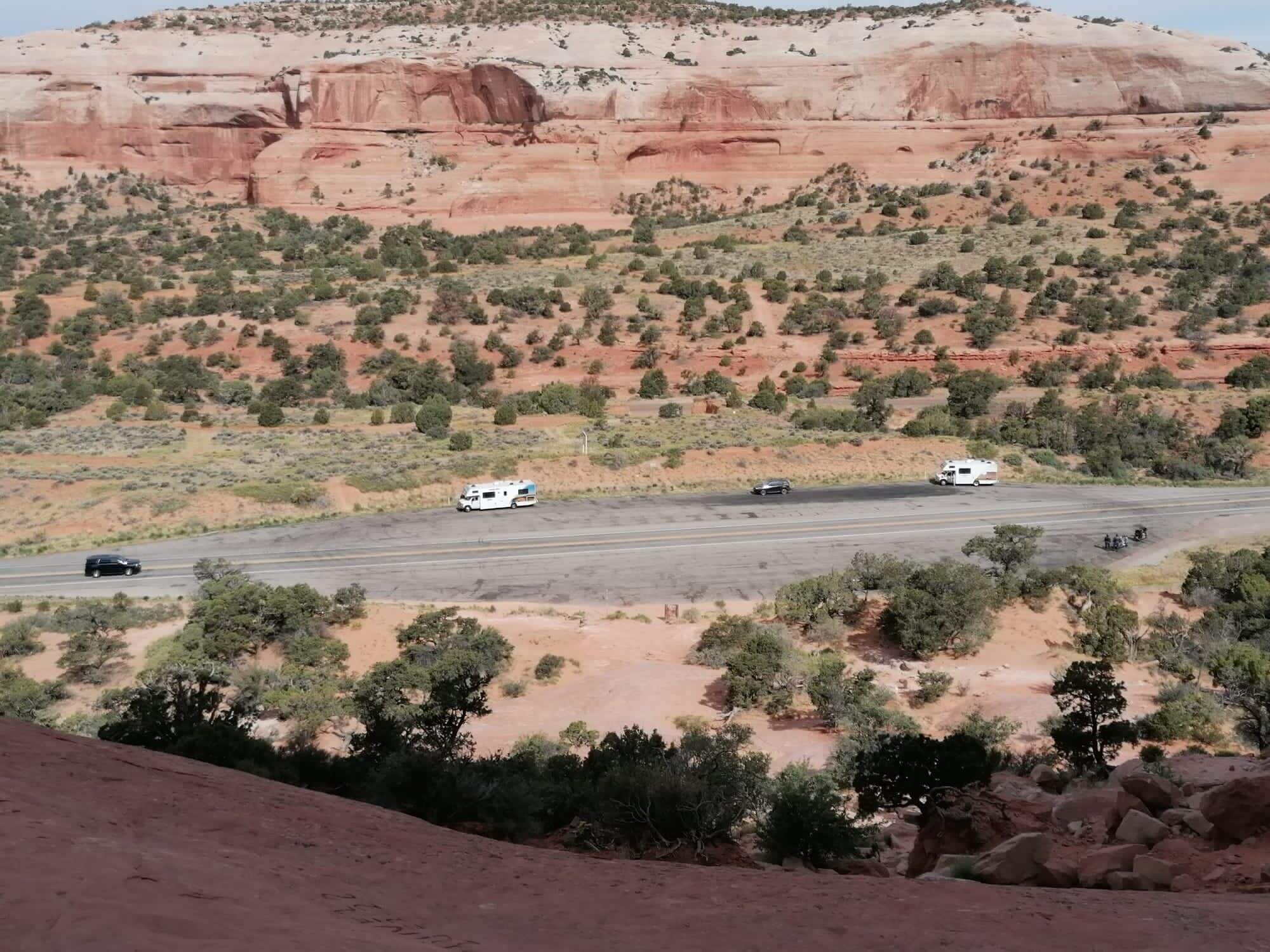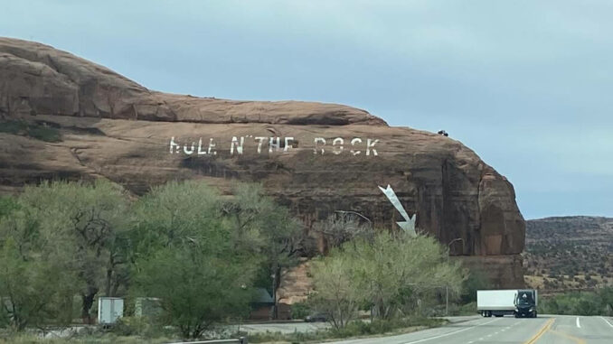 Noch einmal fahren wir durch die lebendige Indianerstadt Moab, bevor wir wieder in ländliche Gegenden eintauchen. Zunächst erleben wir noch einmal die runden, weichen, vom Wind geschliffenen Felsformationen des Arches, noch einmal ein „Hole in the Rock“, bevor es hinaus geht in die Prärie. Die Straße verläuft geradeaus, ein typisch amerikanischer Highway.