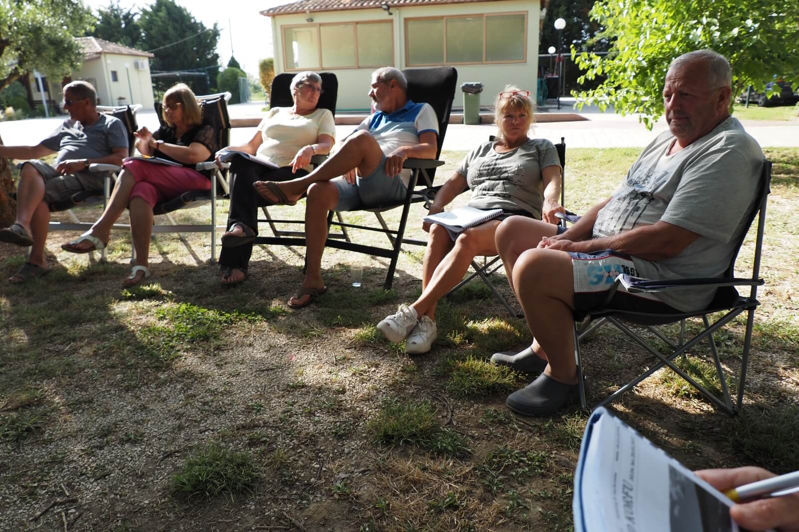 Nach den vielen vergangenen Fahr- und Besichtigungstagen ist dieser Ruhetag willkommen. Die Sonne lädt zu Baden ein – natürlich in der berühmten Ochsenbauchbucht. Aber auch mal relaxen, lesen oder einfach am Strand spazieren gehen und vielleicht mit dem Nachbarn nur klönen. Vor der abendlichen Teilnehmerbesprechung galt nochmals der Dank all denen, die sich an der Vorbereitung und dem Gelingen unserer letzten Campertafel beteiligt haben. In der letzten Teilnehmerbesprechung unserer Reise wurden die nächsten Tage besprochen. Nach Olympia und unserem Abschiedsessen geht es leider nach Patras und damit zum Ende unserer gemeinsamen Reise. Aber erst mal steht uns mit Olympia noch eine erfahrungsreiche Besichtigung bevor.