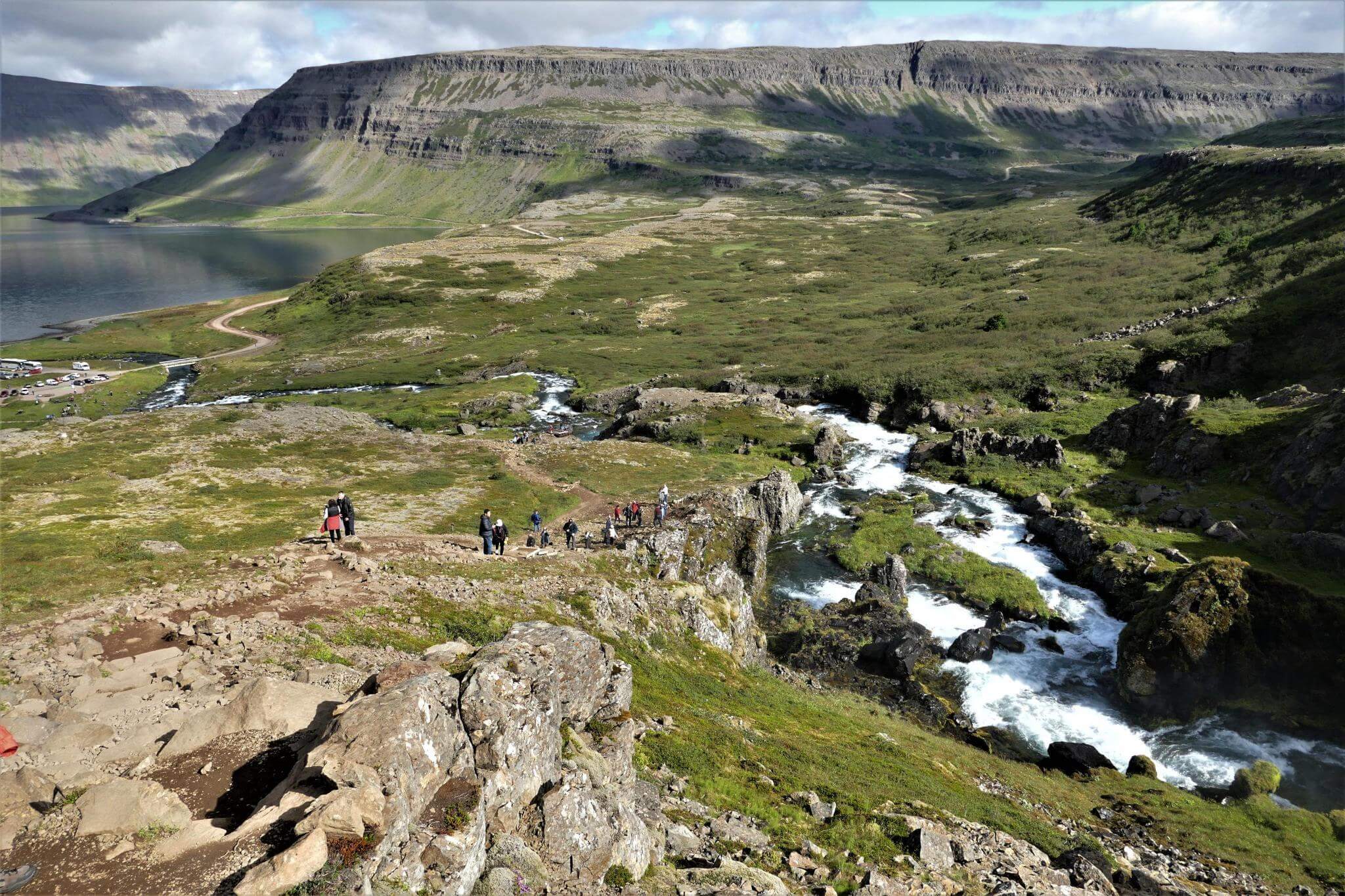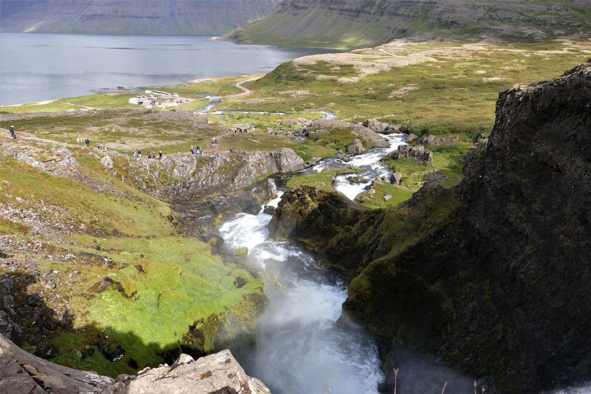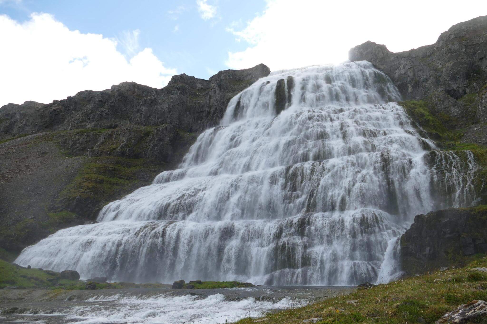 Der Stopp am Dynjandi Wasserfall ist ein Muß. Über eine Breite von 60m stützt das Wasser in die Tiefe und fächert sich auf eine Breite von ca. 100m wie ein Schleier.