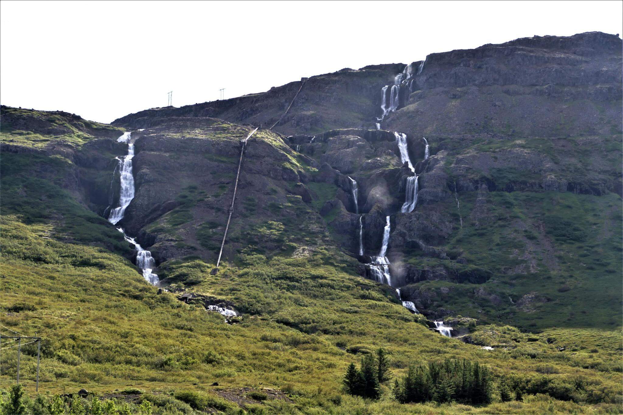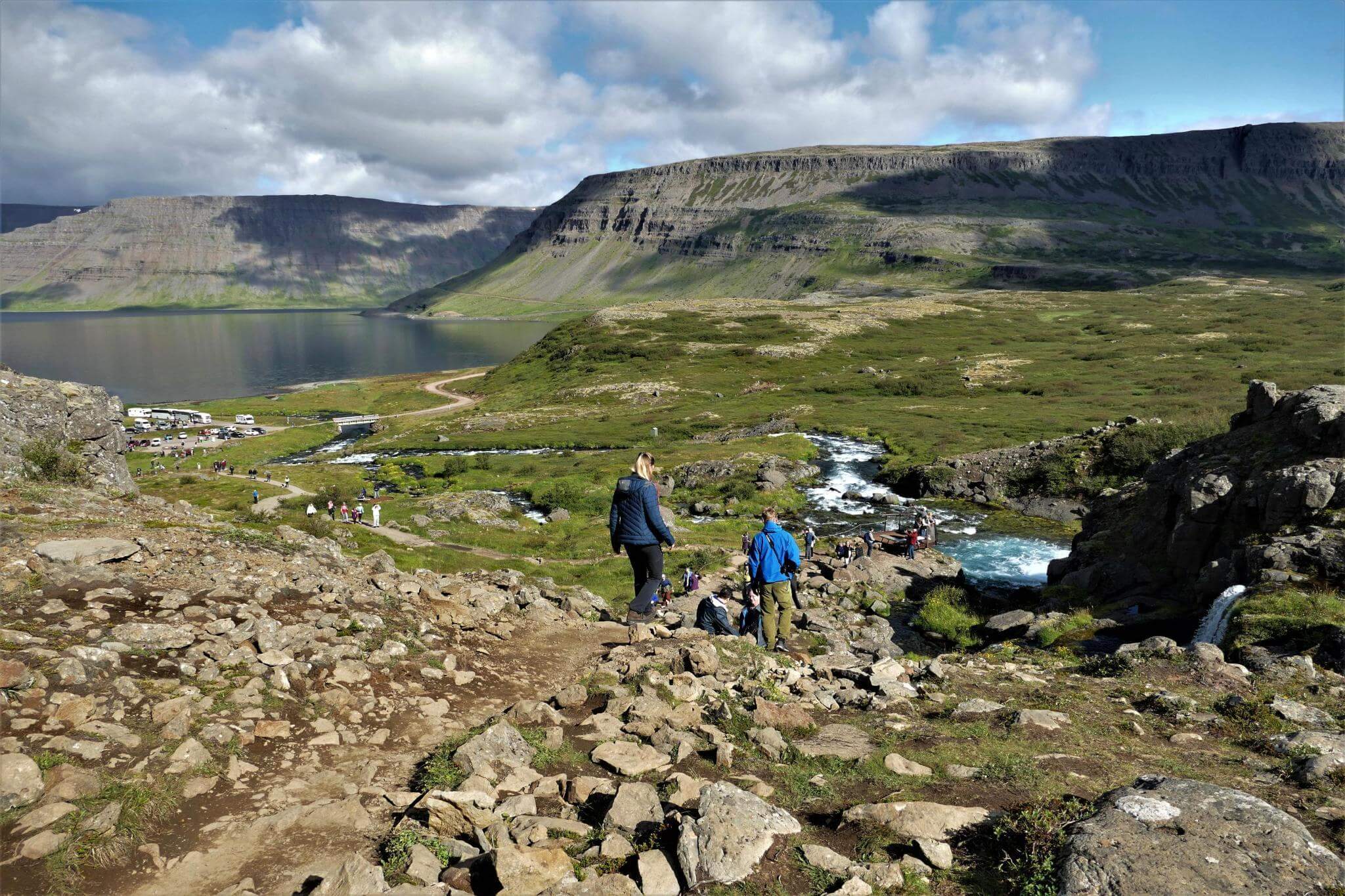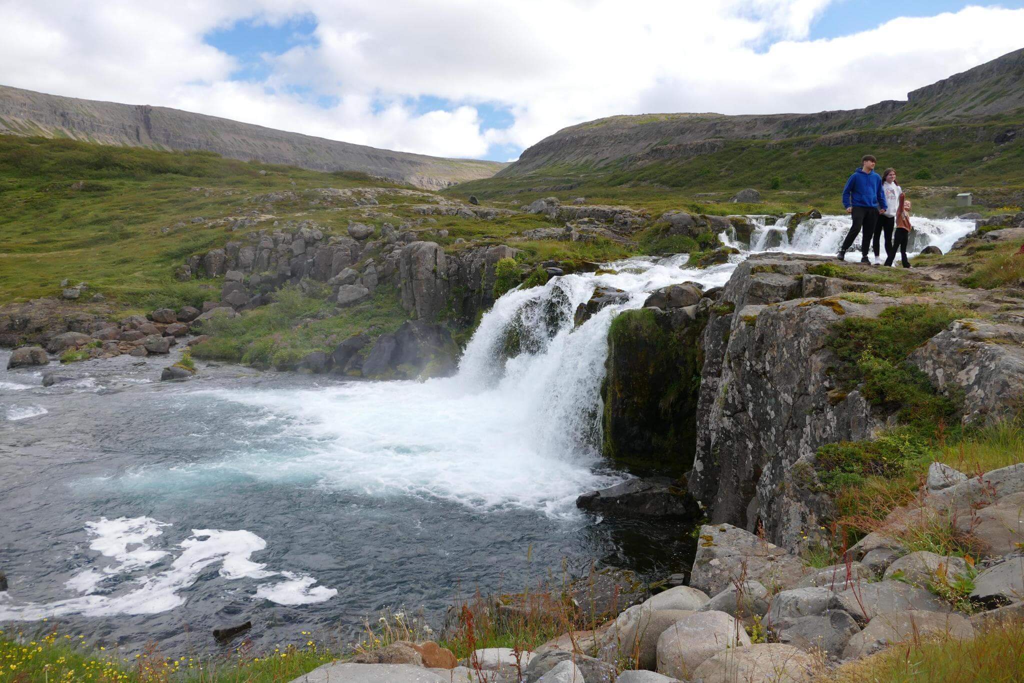 Der Stopp am Dynjandi Wasserfall ist ein Muß. Über eine Breite von 60m stützt das Wasser in die Tiefe und fächert sich auf eine Breite von ca. 100m wie ein Schleier.