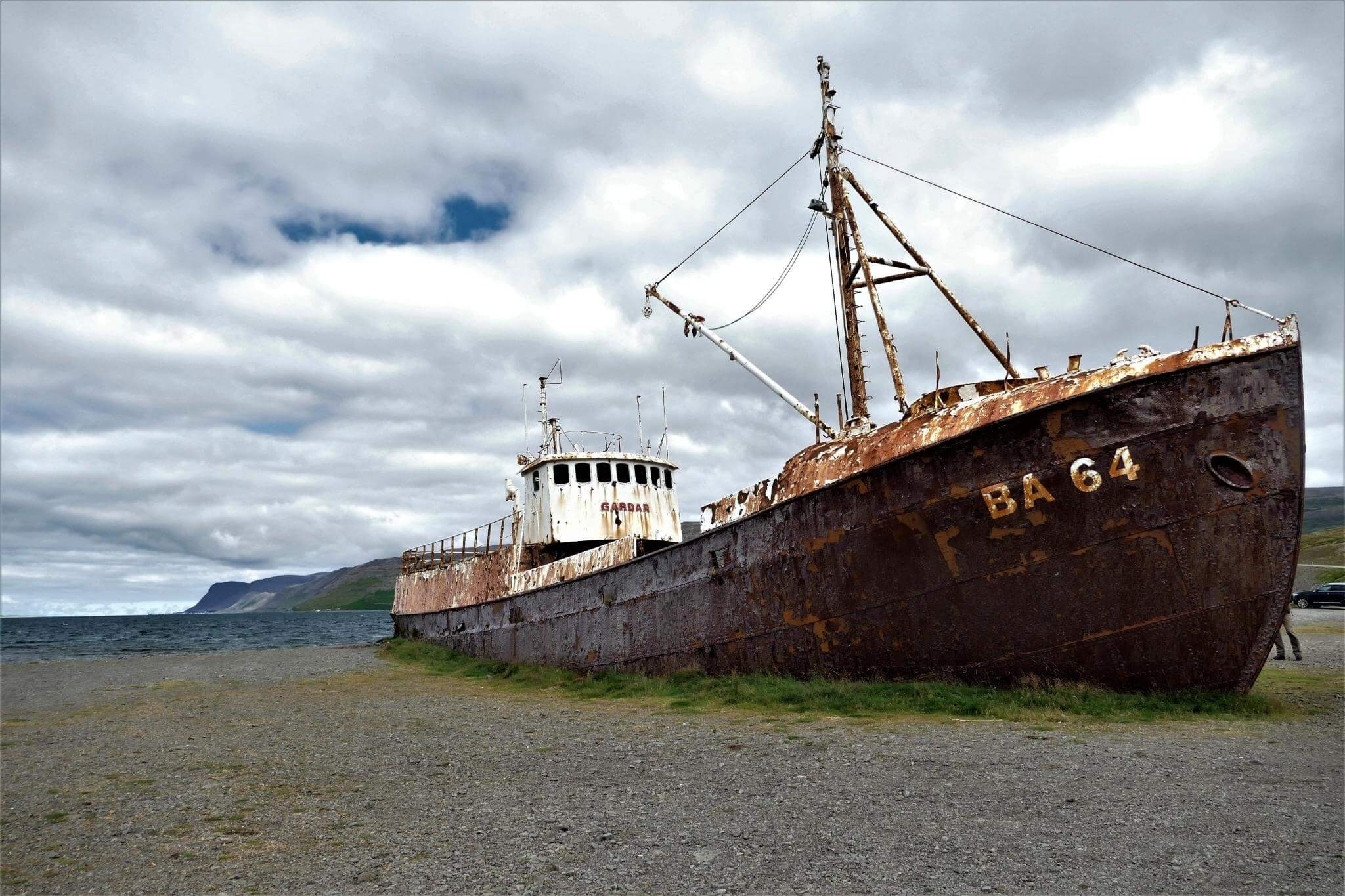 Bald treffen wir auf die BA64, Islands ältestes Stahlschiff, gebaut 1912 und ausgemustert 1981 am Strand und von da an sich selbst überlassen.