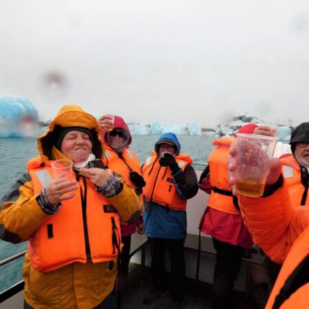 Für das Präsentationsstück des Gletschereises haben wir nach den Erklärungen auch schnell Verwendung. Die Reiseleitung hat eine Flasche Whiskey mitgebracht. Wir gönnen uns einen Whiskey mit Gletschereis.