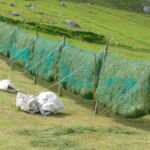 Wir kommen fast ans Ende der Welt nach Tjornovik. Über einspurige, steile und Ampel geregelte Straßen kommen wir in den kleinen, malerischen Ort. Hier ist die Färöer-Welt zu Ende. Heu wird hier in Netzen getrocknet, ohne Netze verschwindet die Ernte durch die starken Winde im Meer.