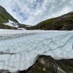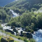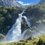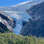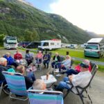 Es geht weiter zu einem Weltnaturerbe der UNESCO, dem Geirangerfjord. Vorerst werden wir jedoch Gletscher besichtigen. Wiederum hinterlässt die norwegische Landschaft auf dem Weg zum Oledalen Gletscher unvergessliche Eindrücke. Bevor wir den Oledalen Gletscher erreichen bietet sich schon mal ein Blick auf den Boyabreen Gletscher. Zum Oledalen Gletscher geht es über eine enge und kurvenreiche Straße zu Parkplätzen, von denen man zu Fuß oder mit kleinen Fahrzeugen bis an den Gletscher gelangt. Dann steht man vor einem grandiosen Naturschauspiel. Der Gletscher wälzt sich durch Felsen ins Tal und endet kurz vor einem See, der das Schmelzwasser aufnimmt und über riesige Wasserfälle ins Tal abgibt. Weiter geht es zum „Fjord der Fjorde“ über die 1.030 m hoch liegende Djupvasshytta. Von dort könnte man zum Dalsnibba abbiegen, aber das heben wir uns für morgen auf. Über eine kurvenreiche Straße mit viel Gegenverkehr – der Geiranger Fjord hat jährlich über eine Million Besucher – geht es wieder bergab zu unserem heutigen CP direkt am Ende des Fjords. Was die Bremsen dabei zu leisten haben, ist nicht zu überriechen. Für die Bewältigung der fahrerischen Ansprüche der heutigen Tour werden alle im Geiranger Hotel mit einem leckeren Dinner belohnt. Das Wetter gibt uns anschließend die Chance, gemeinsam vor unseren Wohnmobilen den Fahrtag zu erörtern und die Ausfahrt der AIDA mit dem Abschiedsritual, Böllerschüsse vom Land und als Antwort das langanhaltende Tuten des Schiffshorns, zu erleben.