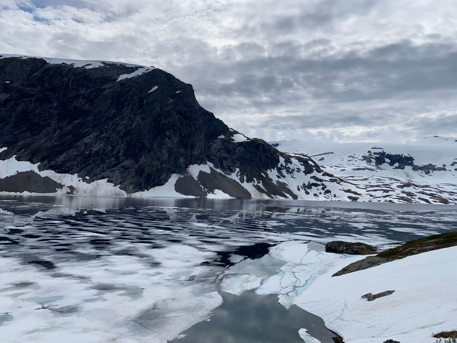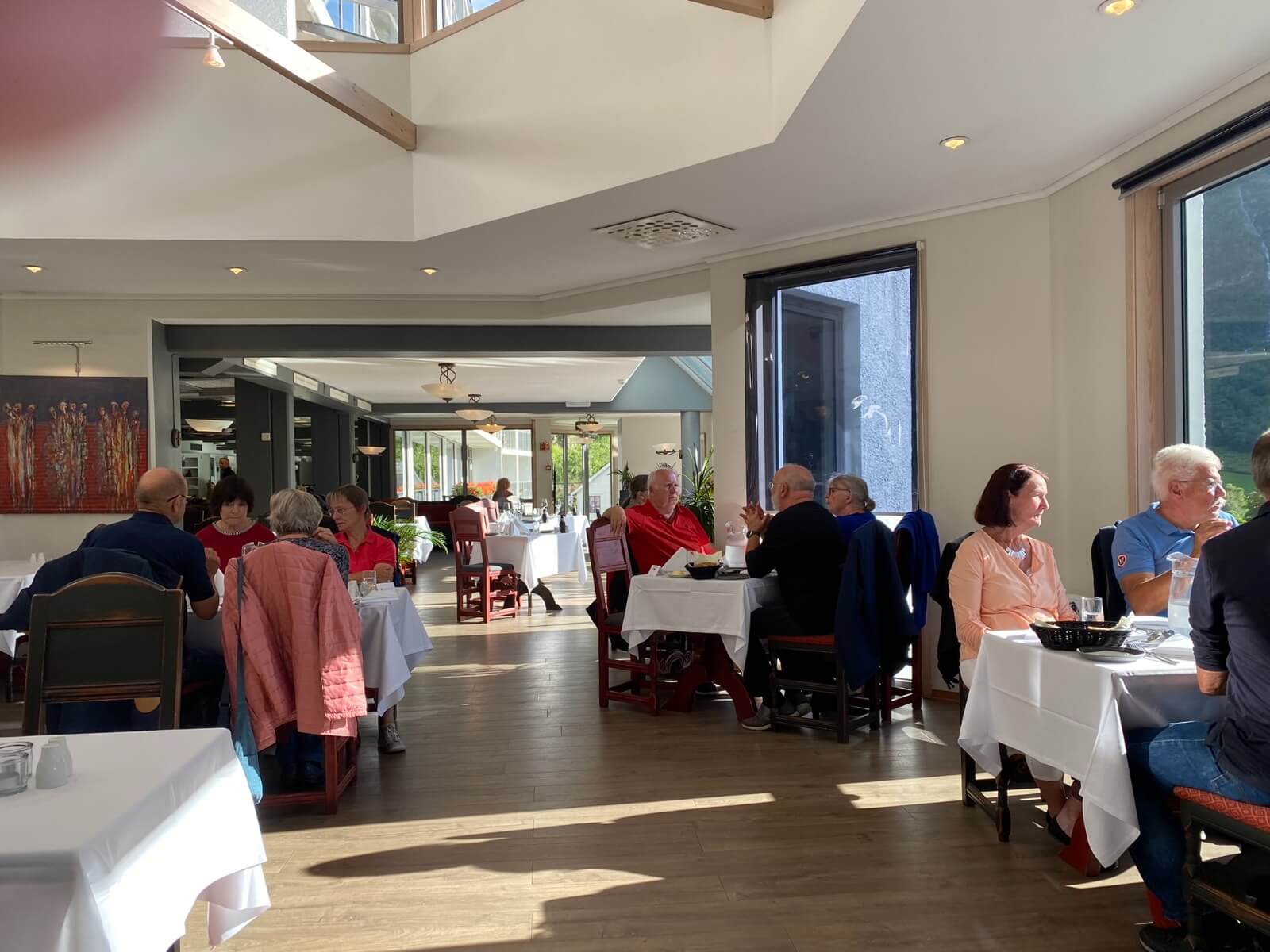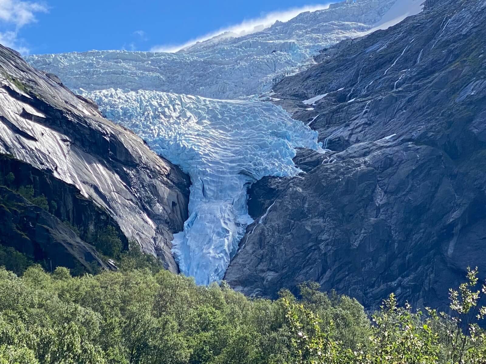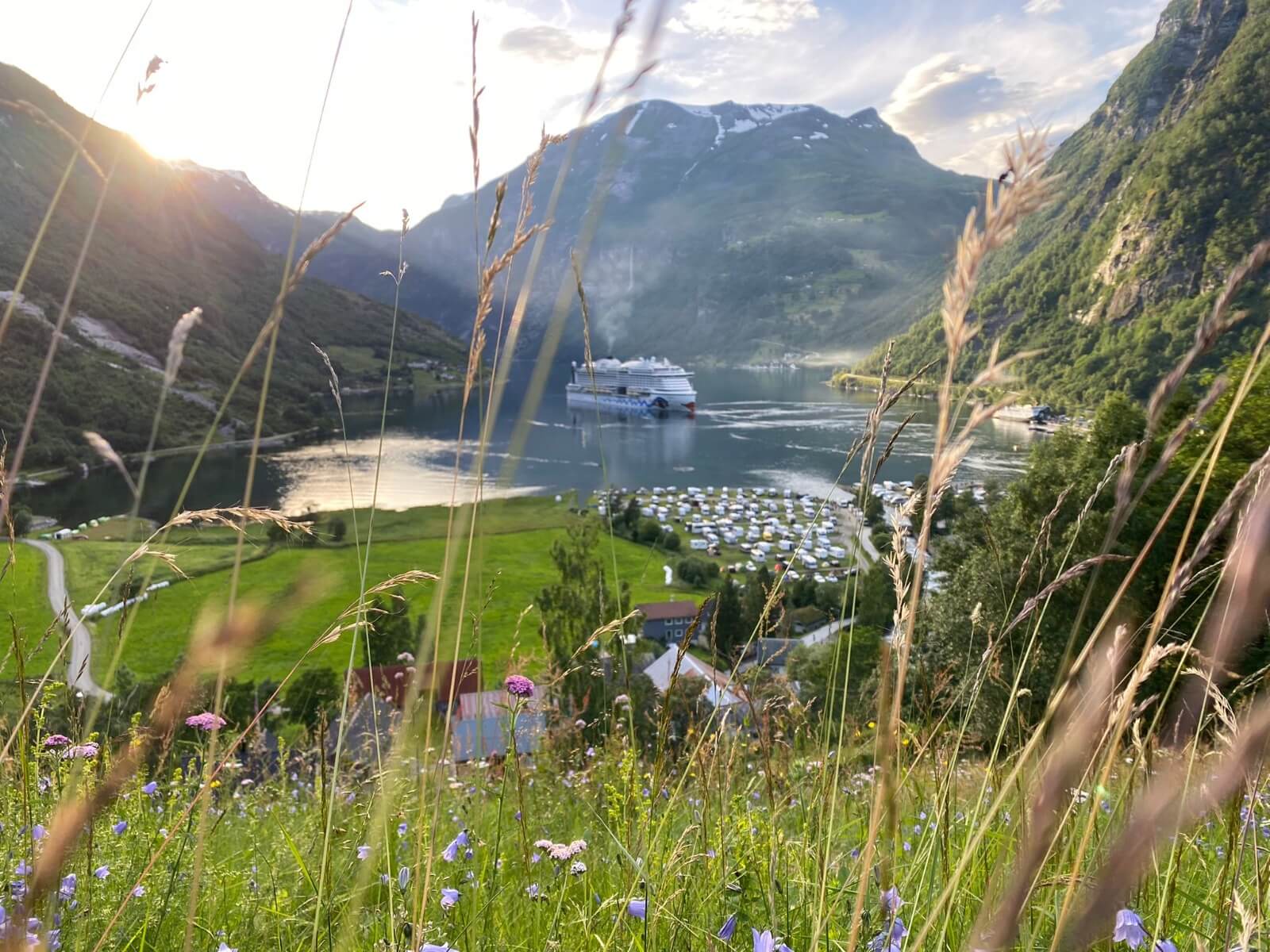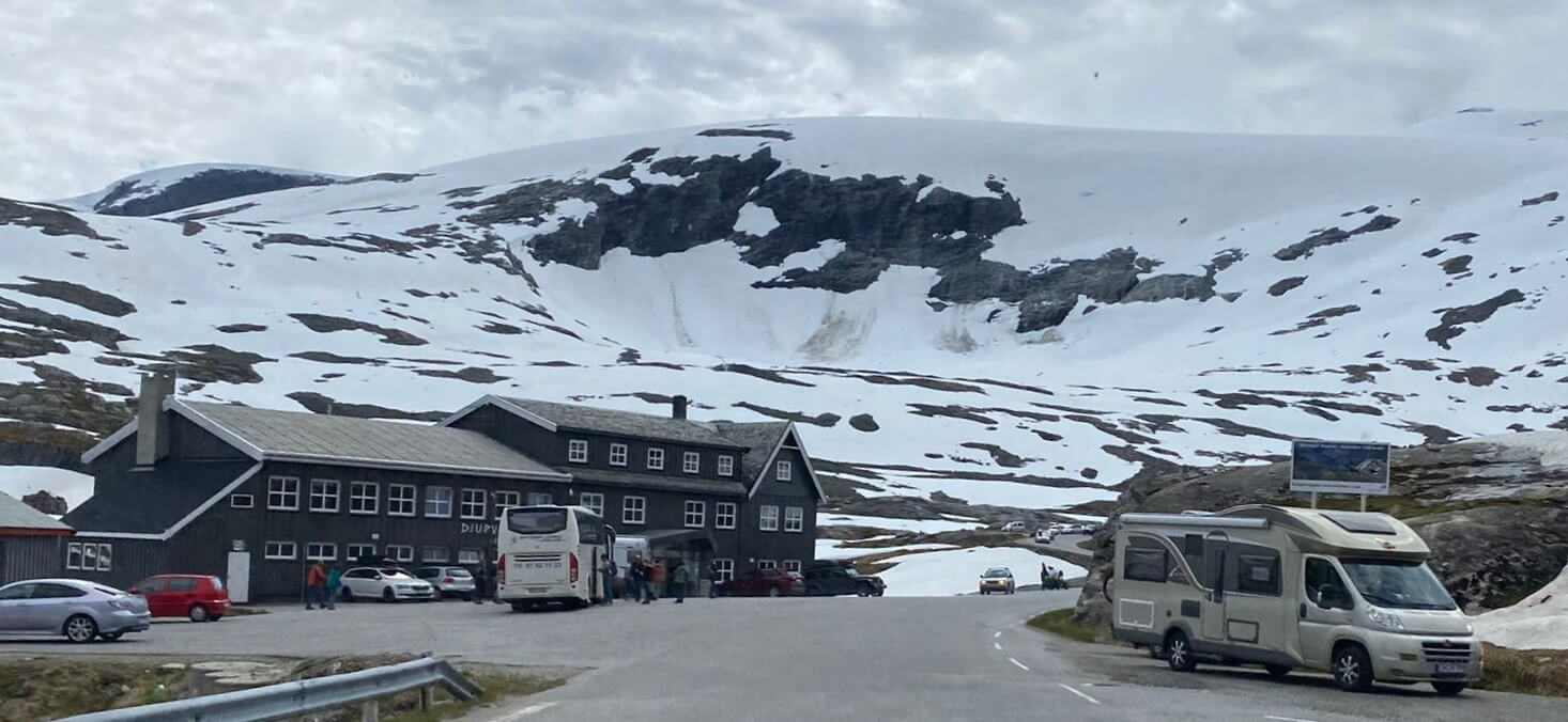 Es geht weiter zu einem Weltnaturerbe der UNESCO, dem Geirangerfjord. Vorerst werden wir jedoch Gletscher besichtigen. Wiederum hinterlässt die norwegische Landschaft auf dem Weg zum Oledalen Gletscher unvergessliche Eindrücke. Bevor wir den Oledalen Gletscher erreichen bietet sich schon mal ein Blick auf den Boyabreen Gletscher. Zum Oledalen Gletscher geht es über eine enge und kurvenreiche Straße zu Parkplätzen, von denen man zu Fuß oder mit kleinen Fahrzeugen bis an den Gletscher gelangt. Dann steht man vor einem grandiosen Naturschauspiel. Der Gletscher wälzt sich durch Felsen ins Tal und endet kurz vor einem See, der das Schmelzwasser aufnimmt und über riesige Wasserfälle ins Tal abgibt. Weiter geht es zum „Fjord der Fjorde“ über die 1.030 m hoch liegende Djupvasshytta. Von dort könnte man zum Dalsnibba abbiegen, aber das heben wir uns für morgen auf. Über eine kurvenreiche Straße mit viel Gegenverkehr – der Geiranger Fjord hat jährlich über eine Million Besucher – geht es wieder bergab zu unserem heutigen CP direkt am Ende des Fjords. Was die Bremsen dabei zu leisten haben, ist nicht zu überriechen. Für die Bewältigung der fahrerischen Ansprüche der heutigen Tour werden alle im Geiranger Hotel mit einem leckeren Dinner belohnt. Das Wetter gibt uns anschließend die Chance, gemeinsam vor unseren Wohnmobilen den Fahrtag zu erörtern und die Ausfahrt der AIDA mit dem Abschiedsritual, Böllerschüsse vom Land und als Antwort das langanhaltende Tuten des Schiffshorns, zu erleben.