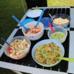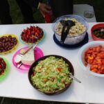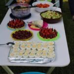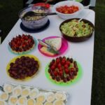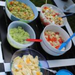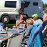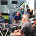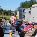 Heute gönnen wir uns wieder einen Ruhetag. Am Vormittag ist es noch recht bewölkt, aber es bleibt trocken. Bei einigen ist die kleine oder große Wäsche angesagt. Am frühen Nachmittag verziehen sich die Wolken und die Sonne kommt durch. Es beginnen die Vorbereitungen für unsere erste Campertafel. Salate werden vorbereitet, Tische und Stühle herbeigebracht und Grills aufgebaut. Auch für Bier, Wein und sonstige flüssige Nachspeisen ist gesorgt. Um 15 Uhr wird bei herrlichem Sonnenschein das Buffet eröffnet. Wir genießen die reichliche Auswahl an Köstlichkeiten und lassen es uns richtig gut gehen.