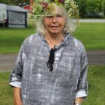 Brigitte überrascht uns mit einem schönen selbstgepflückten Blumenkranz. Das Brauchtum sagt dazu: „Die Blumen müssen schweigend gepflückt werden. Und einen Blumenkranz im Haar zu tragen, ist ein altes Symbol für Wiedergeburt und Fruchtbarkeit.“ Jede Dame unserer Gruppe setzt den Kranz auf – heute feiern wir Mittsommer!